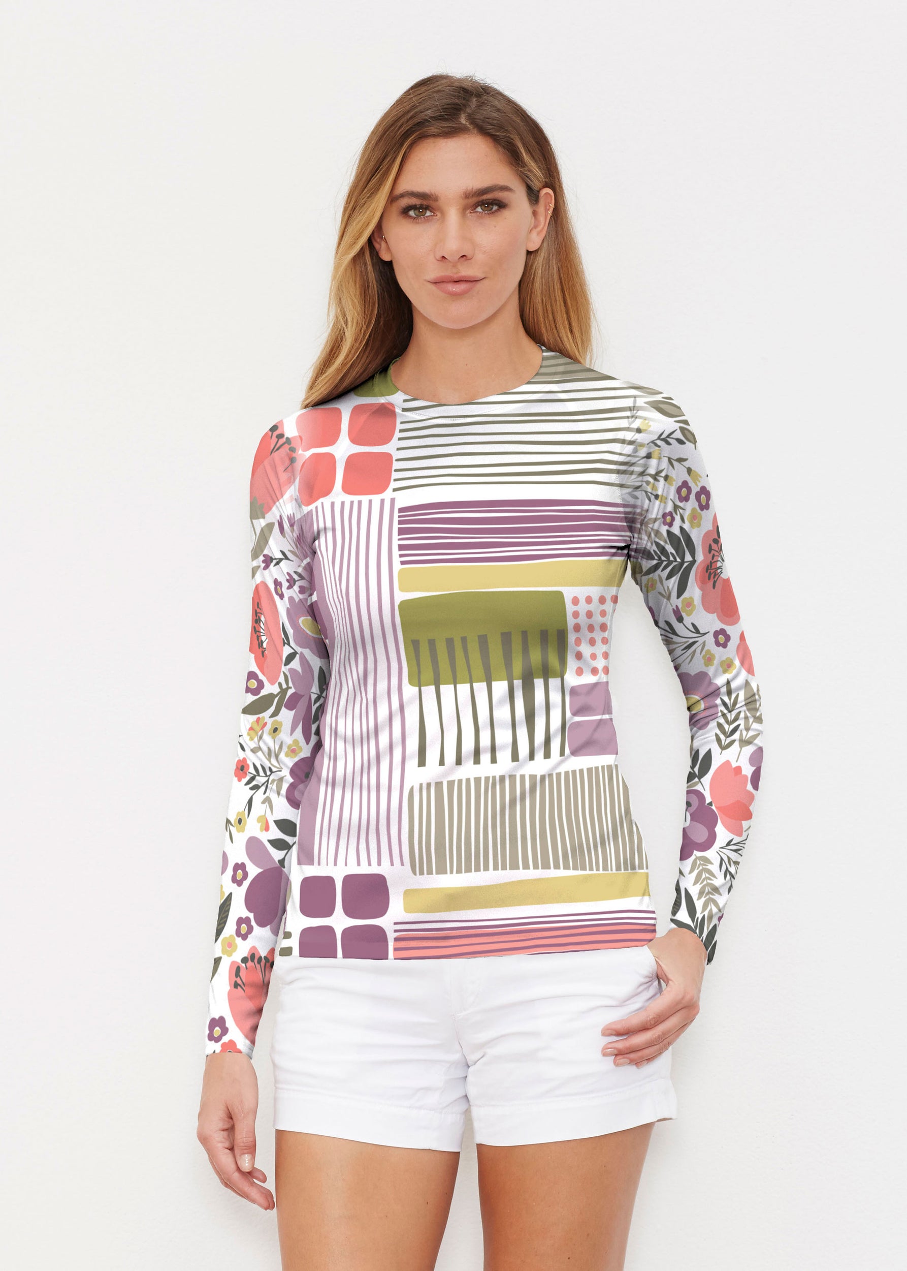 Our WHIMSY ROSE™ Safe Sun UPF 50+ long sleeve, crew neck rash guard offers versatile, beach-to-bistro style, supreme comfort, and an activewear fit. Made in a specially designed Safe Sun textile that blocks more harmful rays and provides a smart solution for those who love to swim, surf, kayak, canoe, waterski, boat, or simply relax waterside.