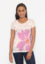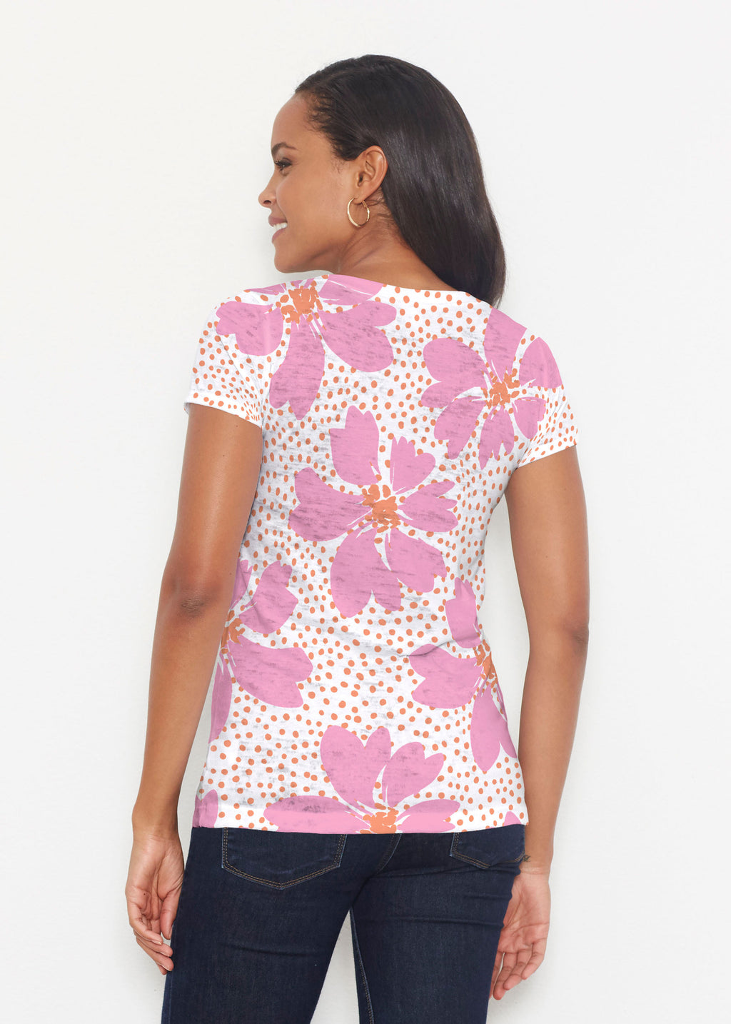 A large hot pink and orange summer bloom afloat a white sea of orange polka dots with a coordinating pattern on back.