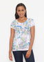 A soft watercolor of turquoise, pink and greens with a splash of whimsical on the sleeves and back.