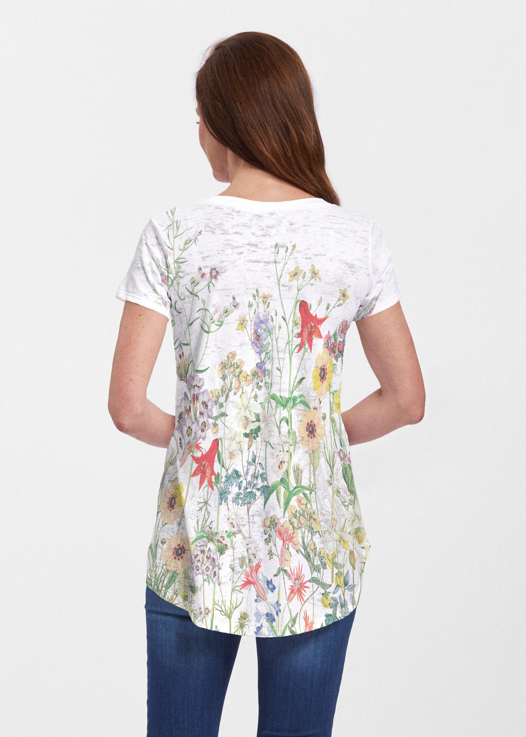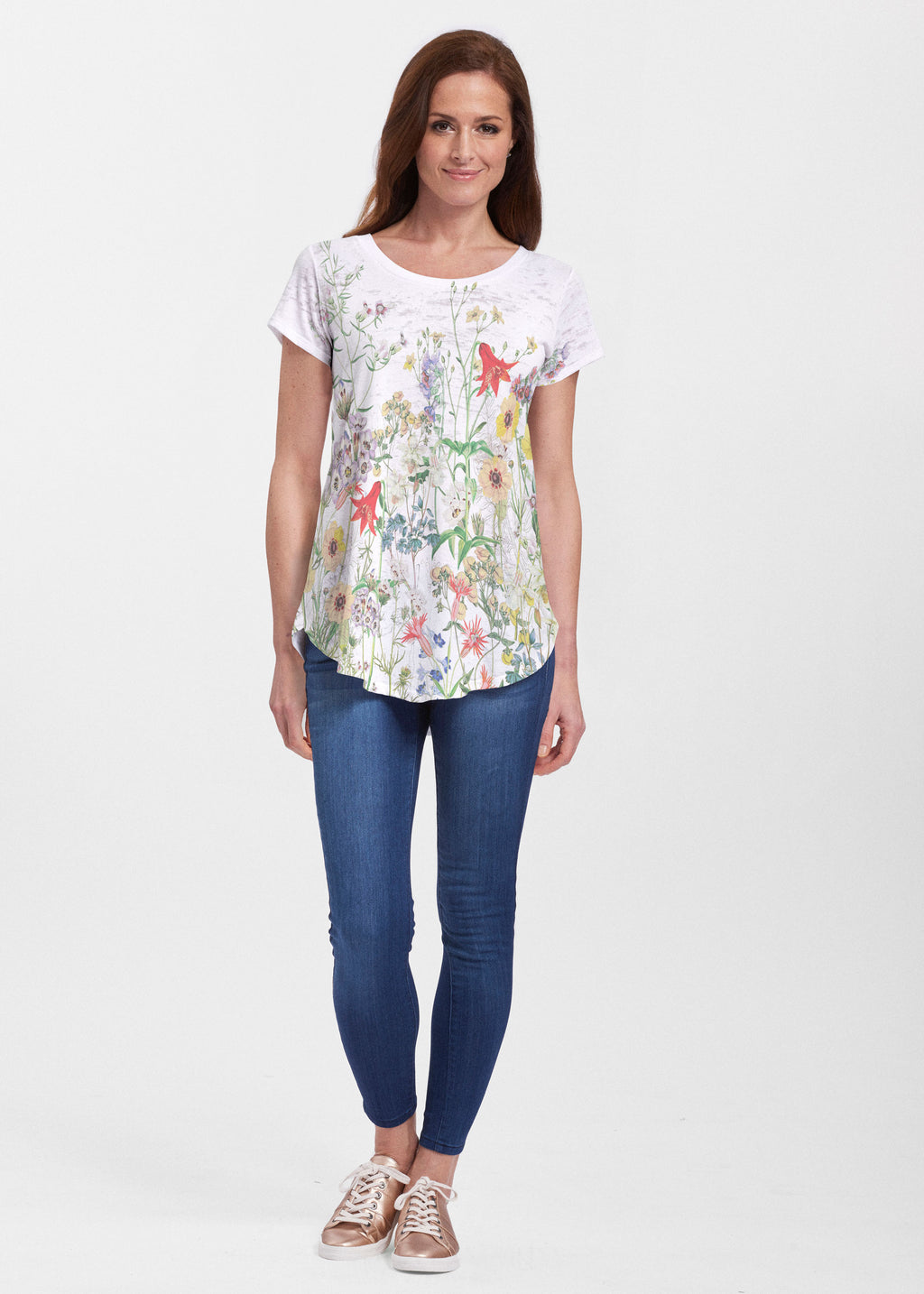 An effortlessly flattering tunic in our soft Signature burnout fabric featuring short sleeves and a scoop neck with a body that flows into a full, swinging shirttail hem.