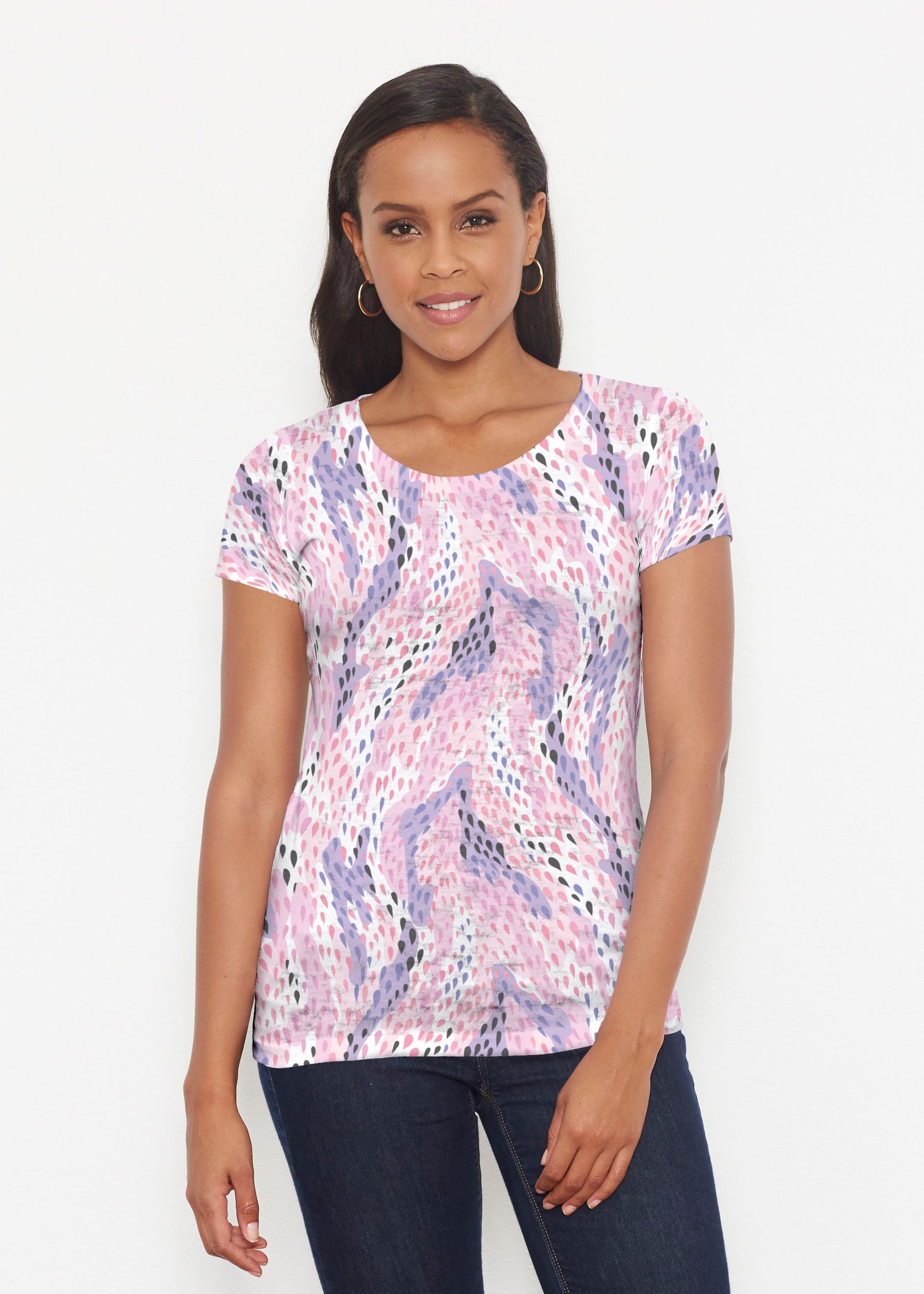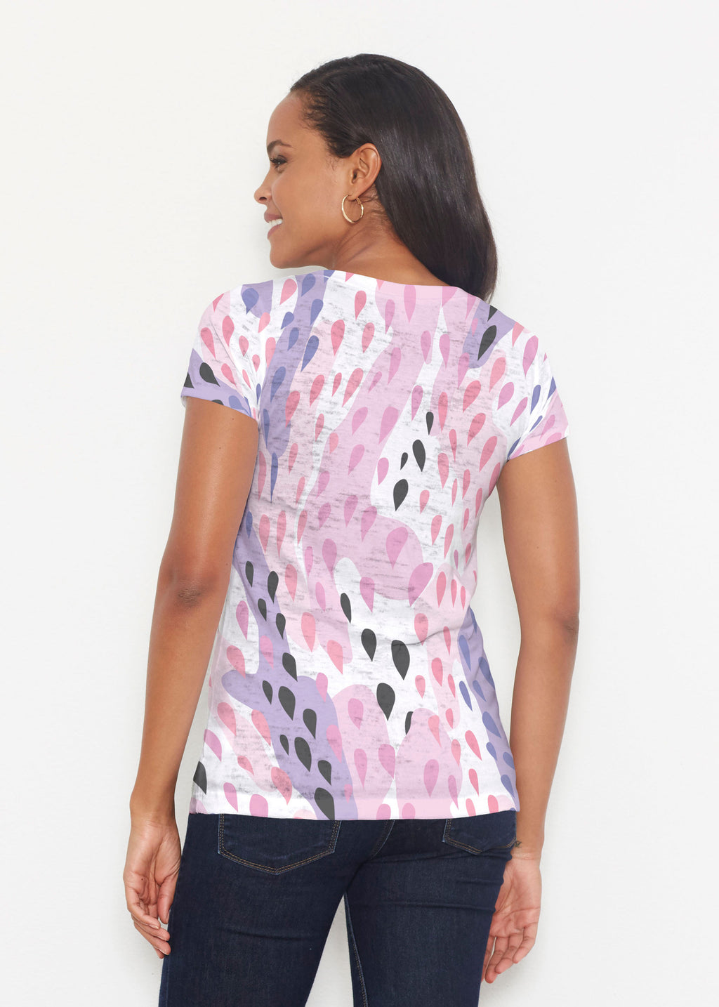 A playful animal print design of raindrops in shades of pink & lavender with a hint of black on a white canvas.