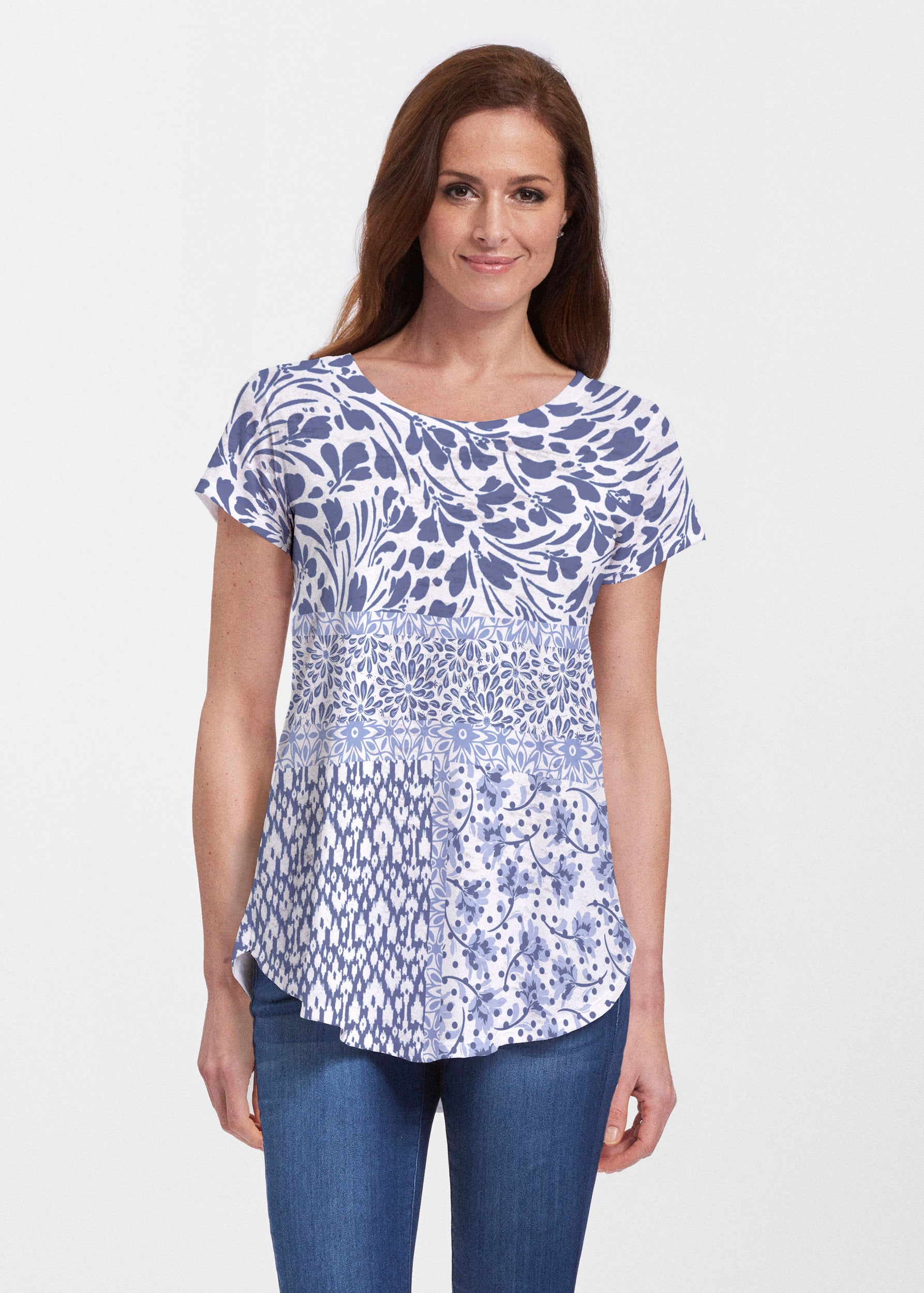 An effortlessly flattering tunic in our soft Signature burnout fabric featuring short sleeves and a scoop neck with a body that flows into a full, swinging shirttail hem.
