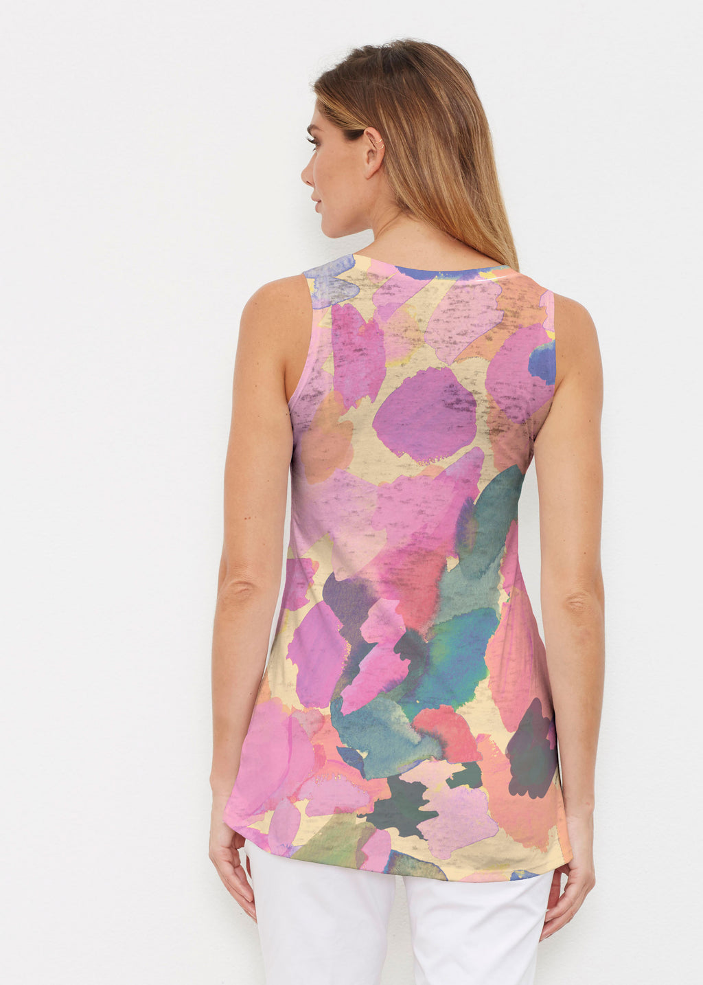 This tank is the perfect combination of an elegant shape with a sporty look. A high-low cascading hemline falls loosely over the hip in our Signature burnout fabric. No sleeves and a shallow scoop neckline give this tank its sporty vibe. -- Your one-of-a-kind garment is created using all-over soft garment sublimation printing. Selected designs are individually printed into your garment. Cotton/Polyester blend.
