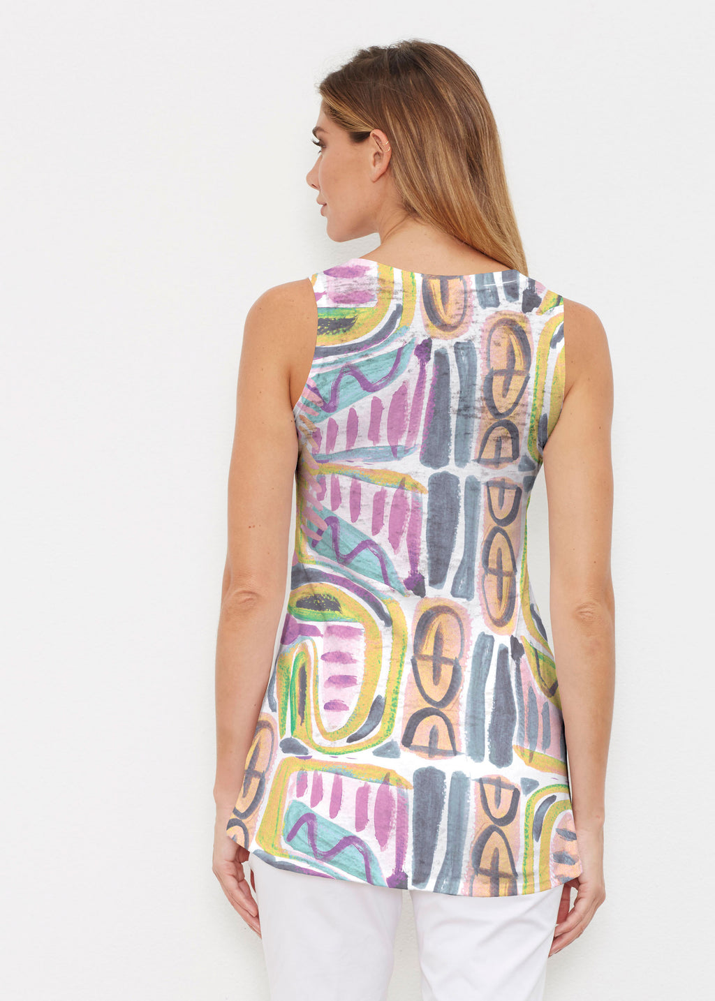 This tank is the perfect combination of an elegant shape with a sporty look. A high-low cascading hemline falls loosely over the hip in our Signature burnout fabric. No sleeves and a shallow scoop neckline give this tank its sporty vibe. -- Your one-of-a-kind garment is created using all-over soft garment sublimation printing. Selected designs are individually printed into your garment. Cotton/Polyester blend.