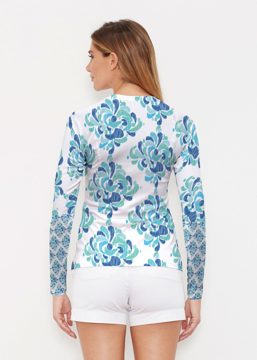 Our WHIMSY ROSE™ Safe Sun UPF 50+ long sleeve, crew neck rash guard offers versatile, beach-to-bistro style, supreme comfort, and an activewear fit. Made in a specially designed Safe Sun textile that blocks more harmful rays and provides a smart solution for those who love to swim, surf, kayak, canoe, waterski, boat, or simply relax waterside.