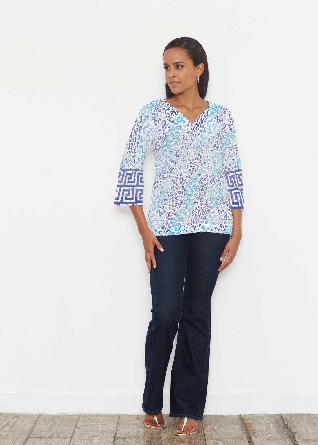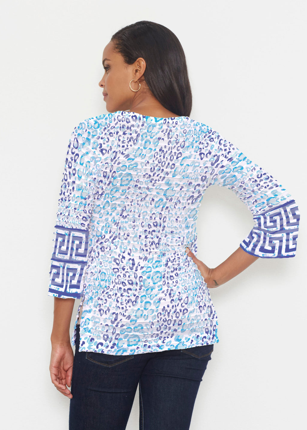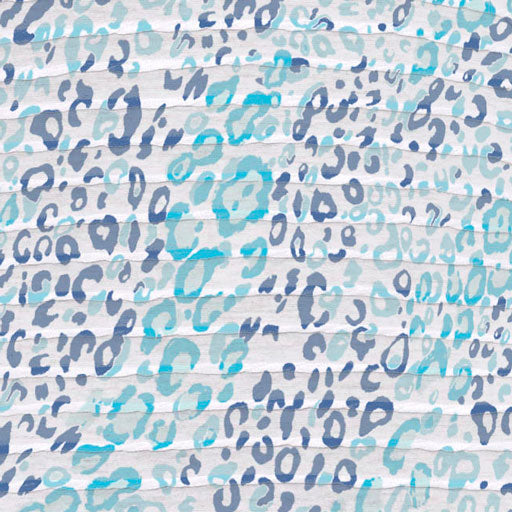 A fun yet sophisticated mixed print with bands of abstract leopard spots in turquoise & mint and navy & aqua with a classic Greek Key pattern on the sleeve ends. Designed by Susan Werner.