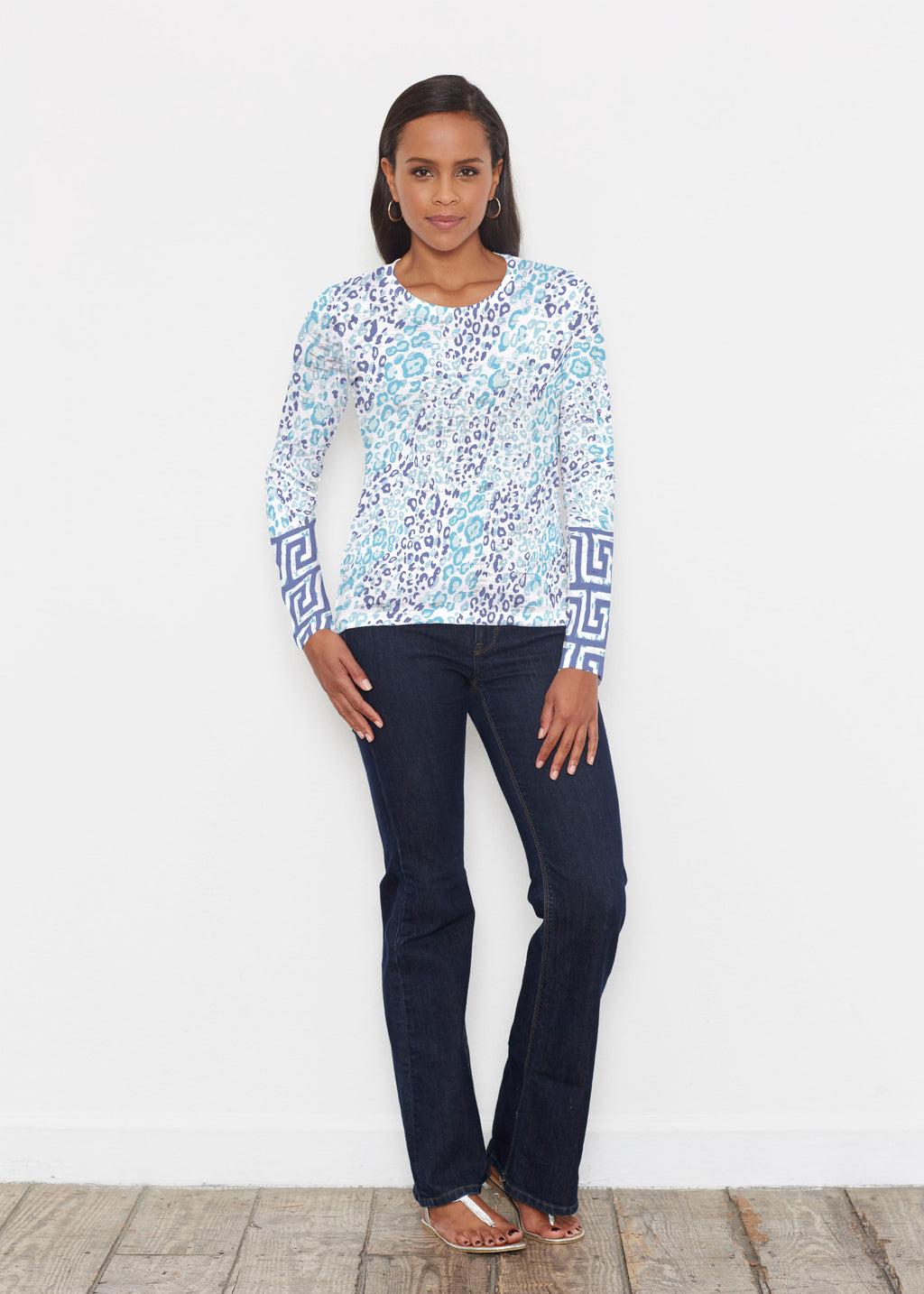 A fun yet sophisticated mixed print with bands of abstract leopard spots in turquoise & mint and navy & aqua with a classic Greek Key pattern on the sleeve ends. Designed by Susan Werner.