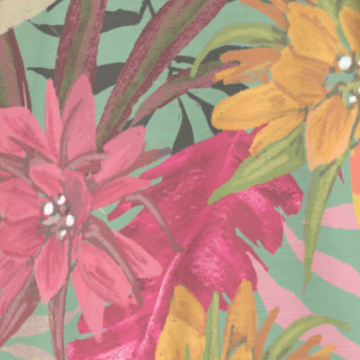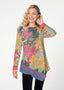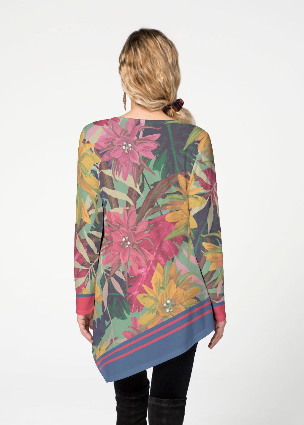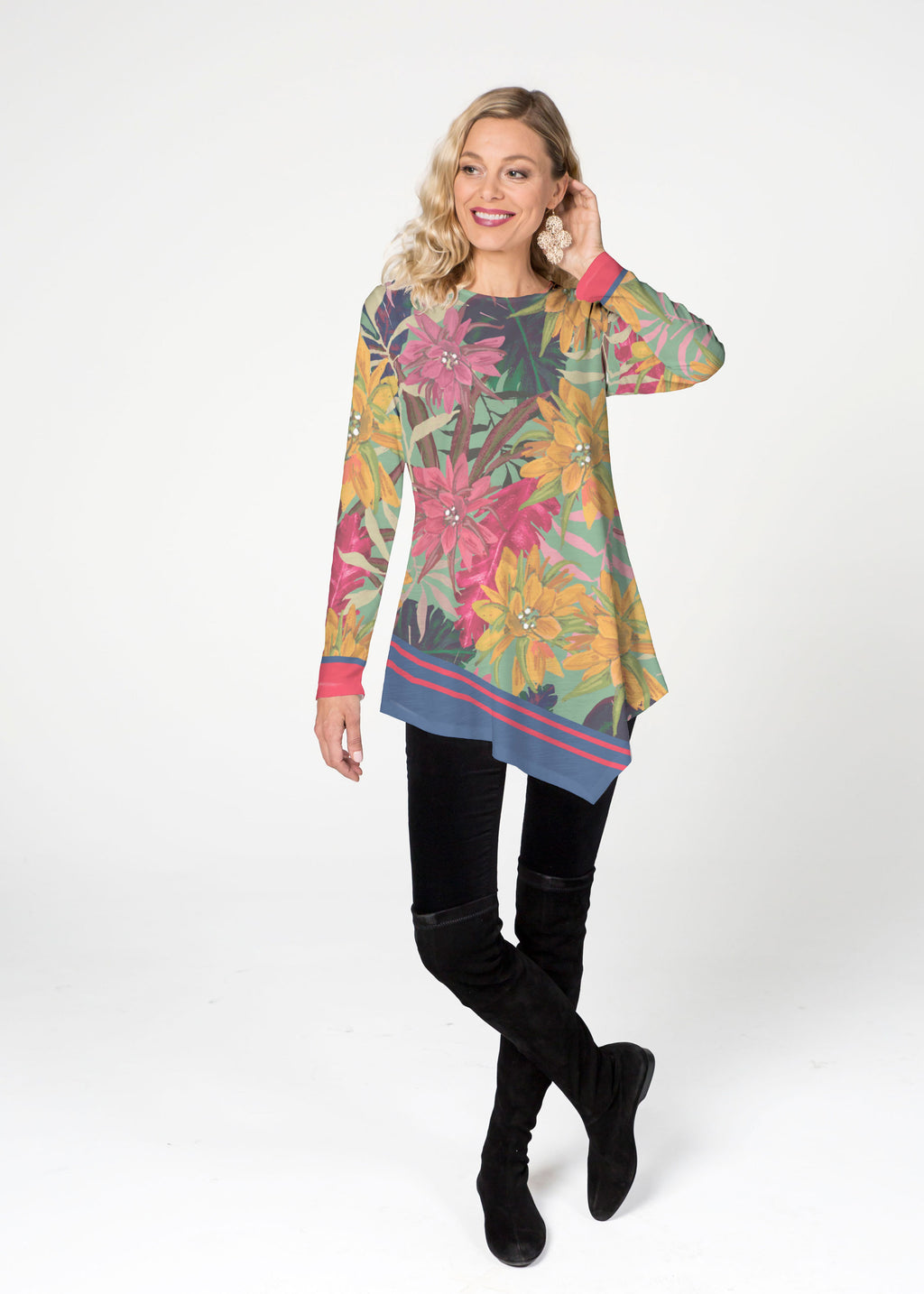 A beautiful mixed floral print in navy, red, yellow and green with a fun trendy striped added at the bottom and sleeves designed by Jeanetta Gonzales