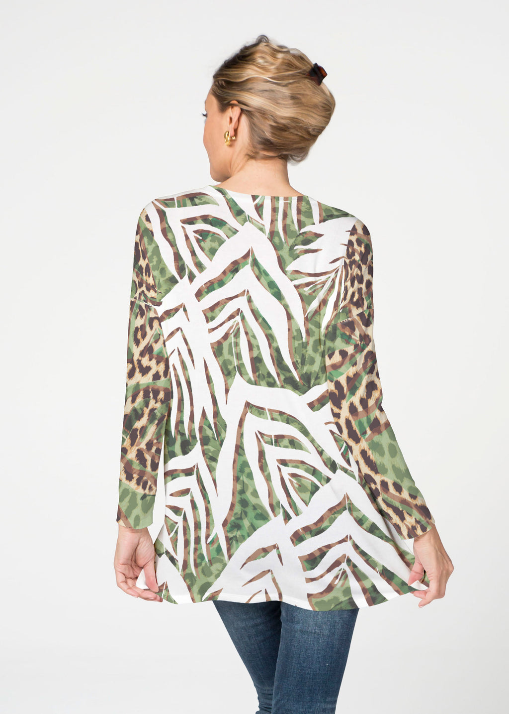 A fun print of mottled dots with chevron inspired mixed sleeves in a beautiful spectrum of blues designed by Susan Werner.