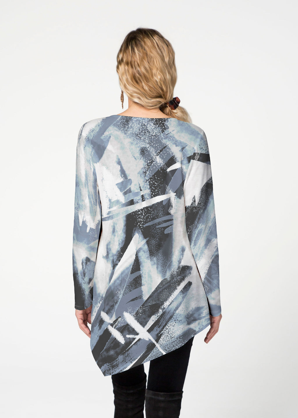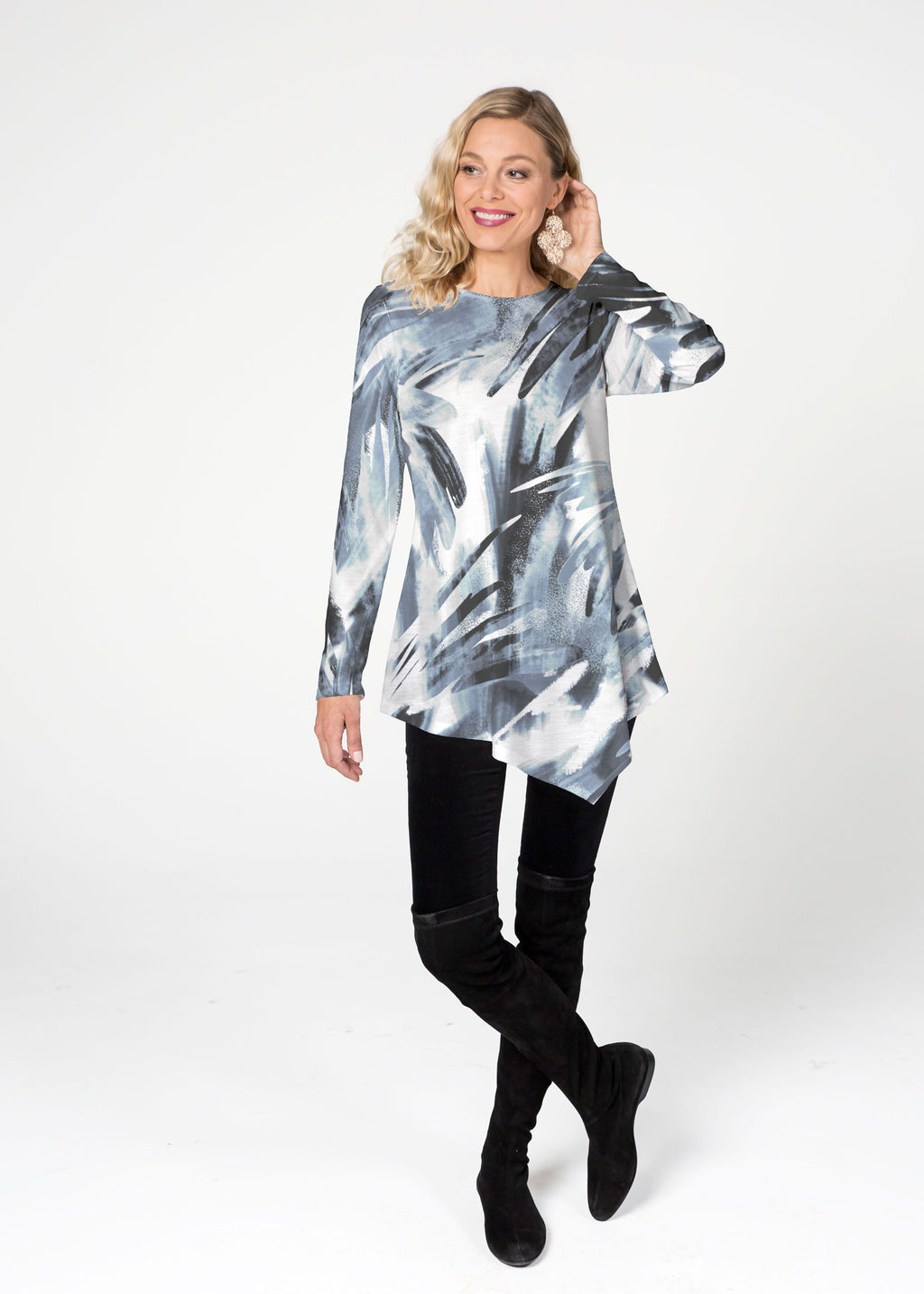 The Asymmetrical French Terry Tunic is soft and lightweight. This Relaxed crew neck features an Asymmetrical hem that falls just below the hip with long sleeves.