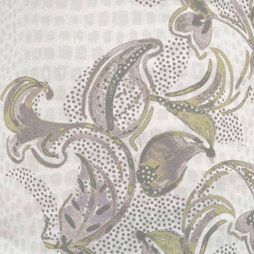 Whimsical loden and grey climbing leafy vine against a crocodile canvas of light grey and contrasting warm grey sleeves.