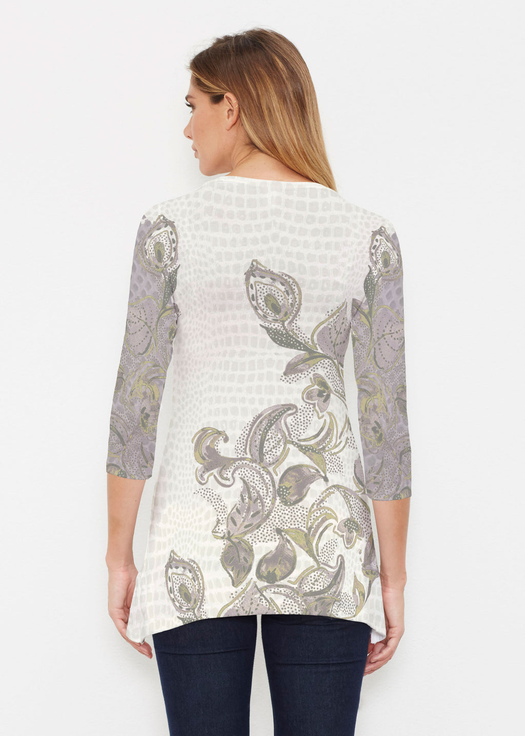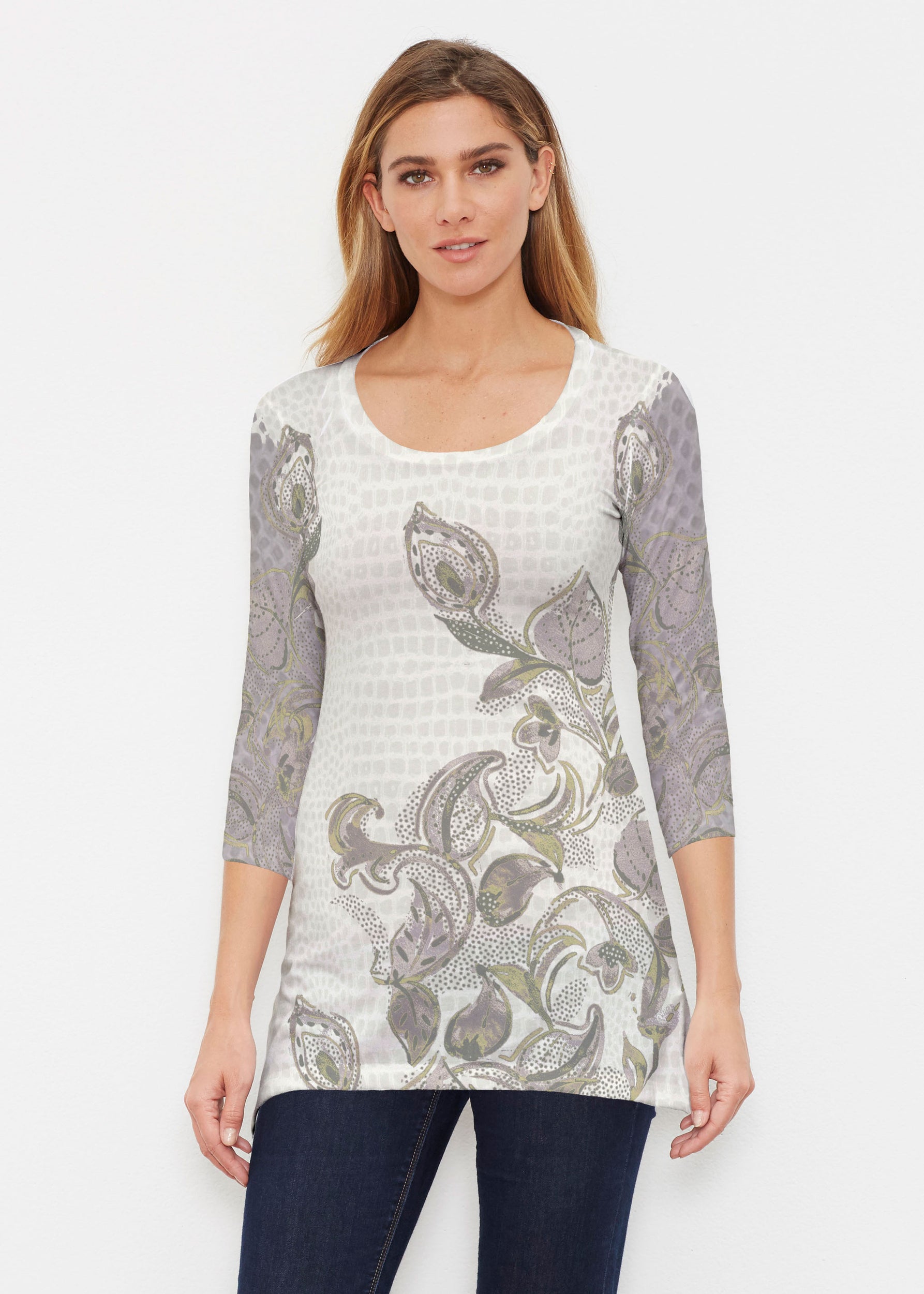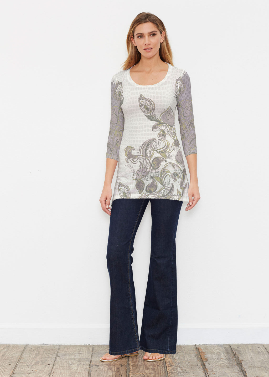 Surprising comfort and style combine in our luxurious Buttersoft blend. A delicate scoop neck, 3/4 sleeve, sweeping curved hemline falls just below the hip.