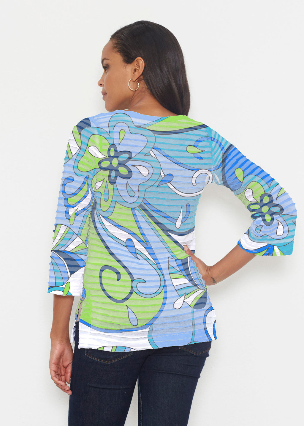 The uniquely soft, pleated texture in this Banded fabric give the 3/4 bell sleeves and sweetheart v-neck a fun and sophisticated look. Flattering side vents adorn the hemline that skims the hip.