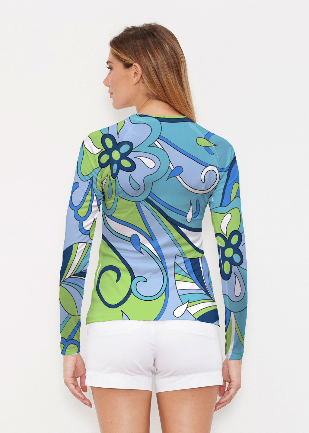 Our WHIMSY ROSE™ Safe Sun UPF 50+ long sleeve, crew neck rash guard offers versatile, beach-to-bistro style, supreme comfort, and an activewear fit. Made in a specially designed Safe Sun textile that blocks more harmful rays and provides a smart solution for those who love to swim, surf, kayak, canoe, waterski, boat, or simply relax waterside.