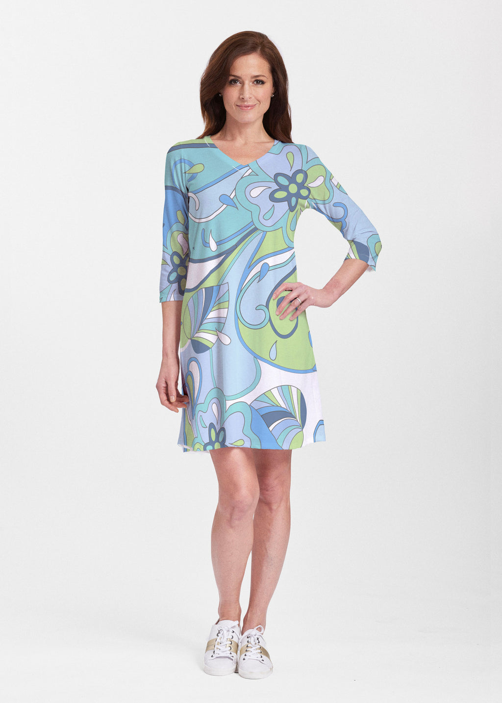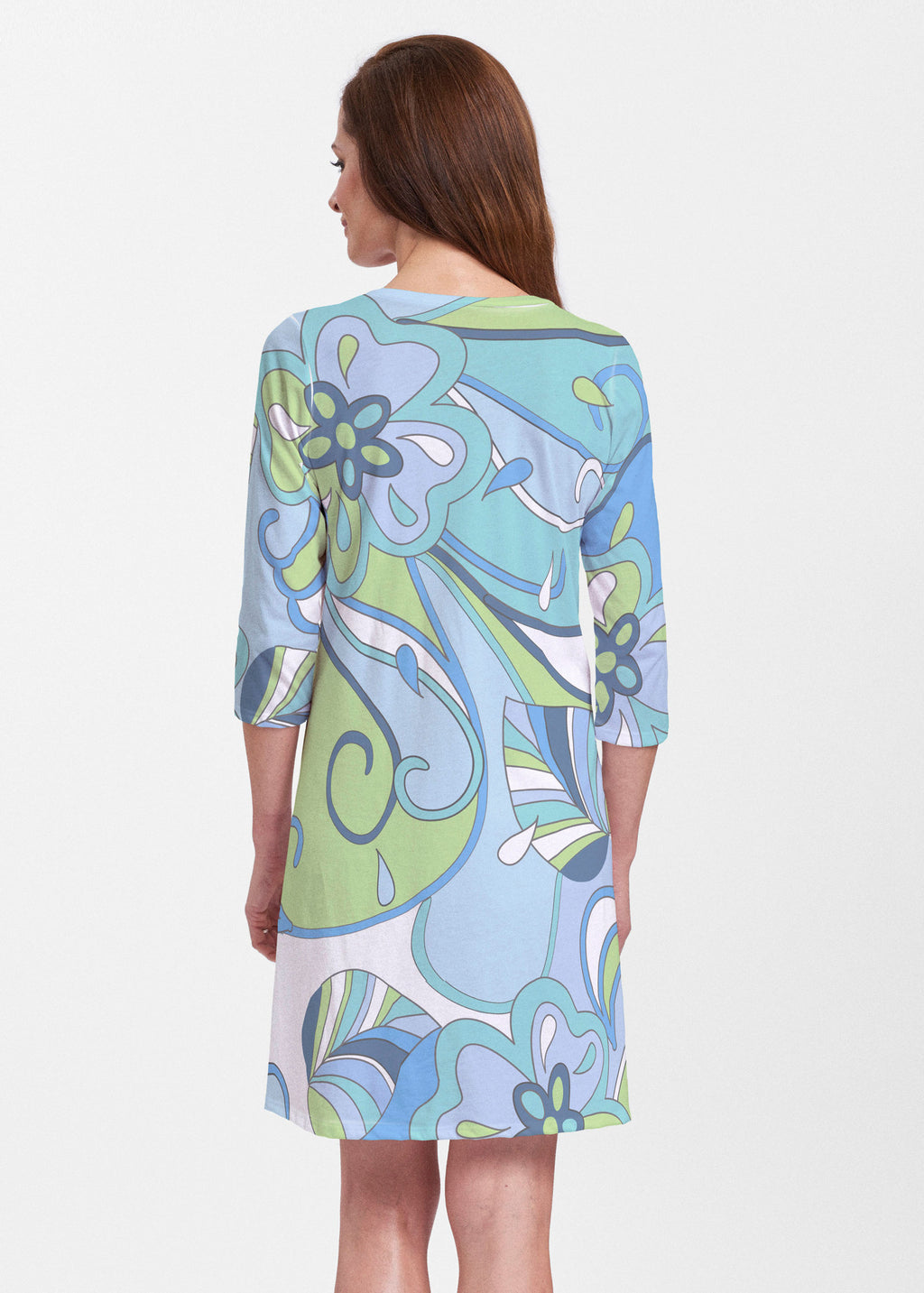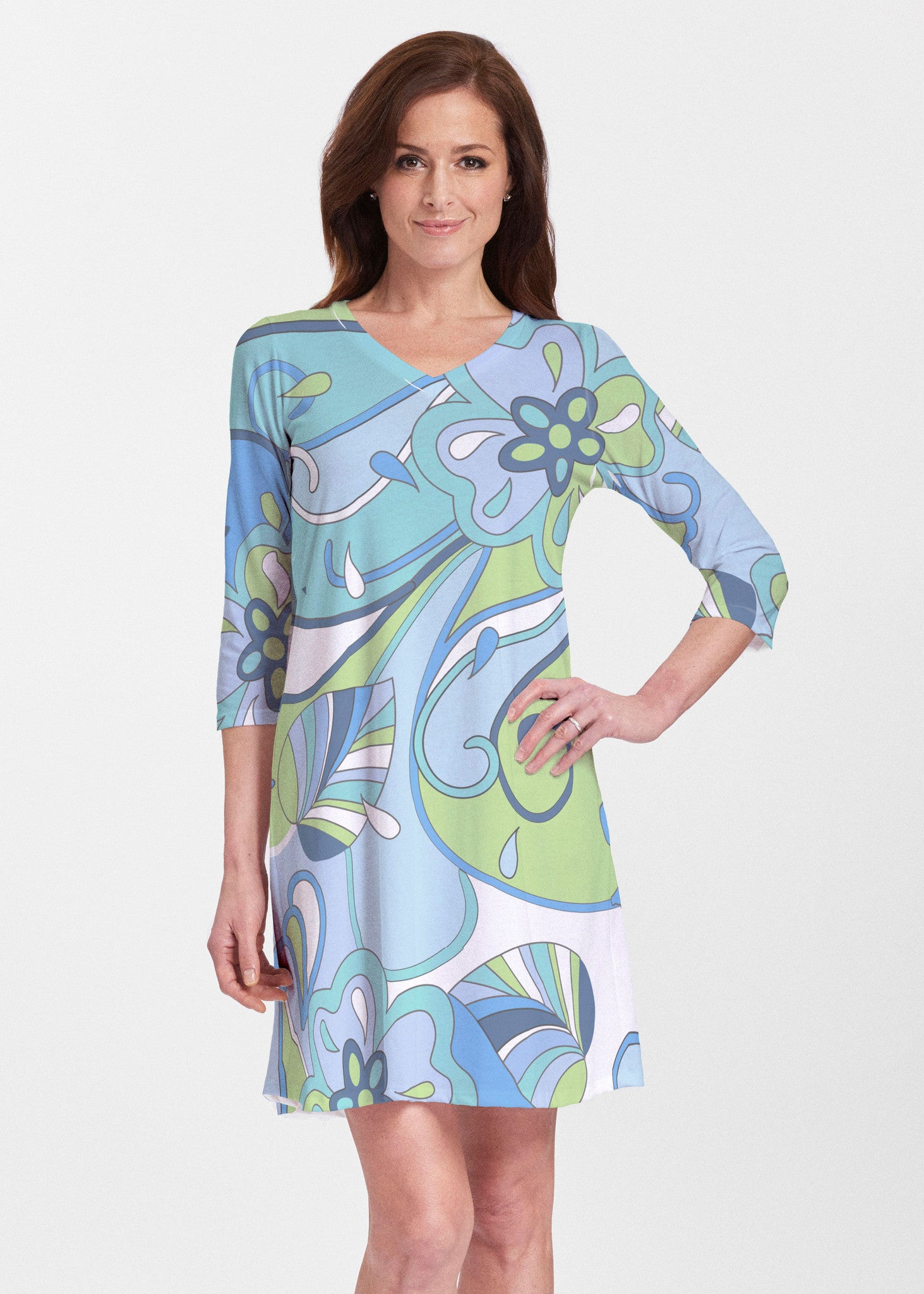 A relaxed swing silhouette with 3/4 sleeves and v-neck make up the newest addition to our Classic dress collection. Hem falls just above the knee.