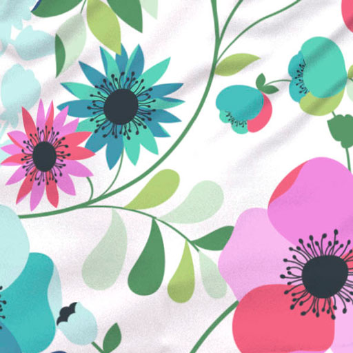A beautiful print of blooming vines and flowering petals in pink and aqua with an aqua and white floral underlay. Designed by Diane Kappa.