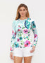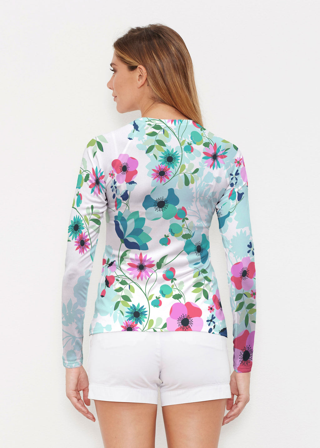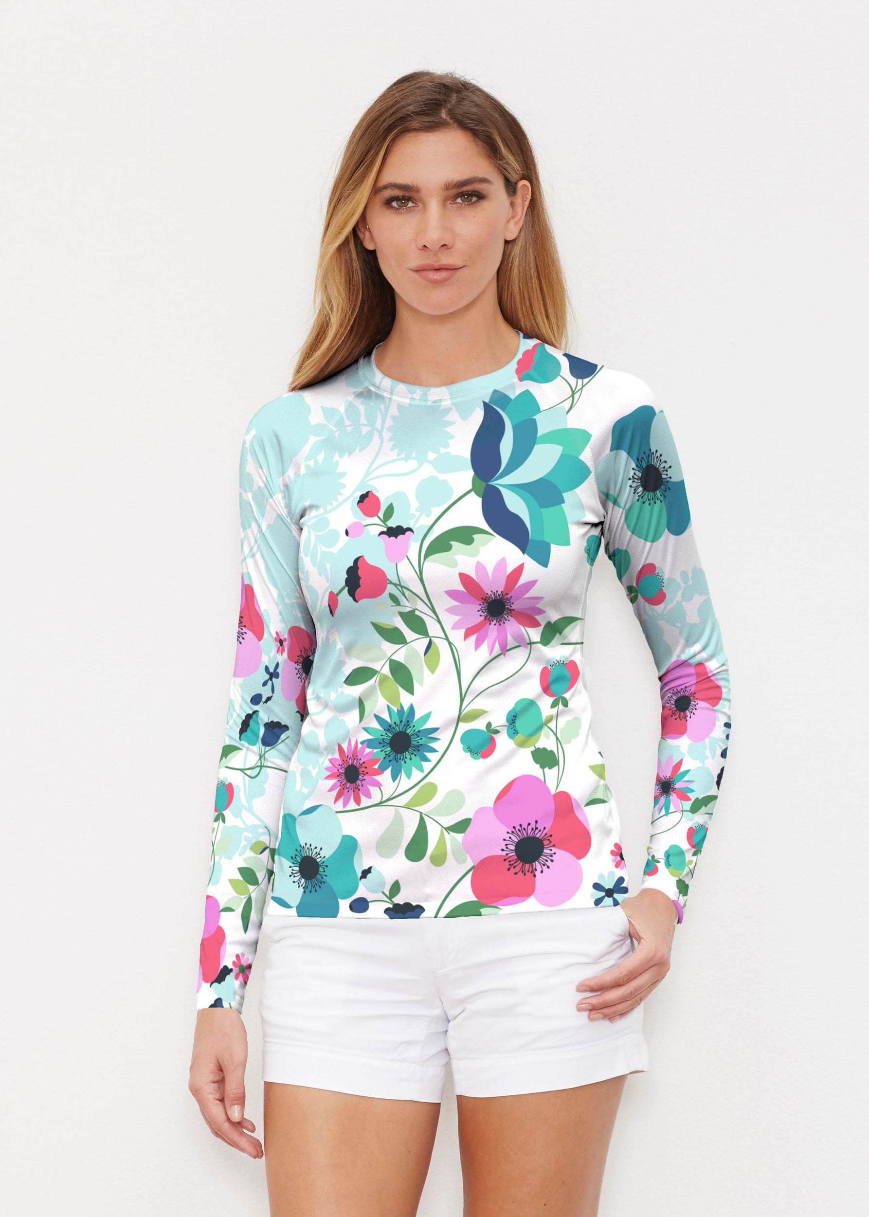Our WHIMSY ROSE™ Safe Sun UPF 50+ long sleeve, crew neck rash guard offers versatile, beach-to-bistro style, supreme comfort, and an activewear fit. Made in a specially designed Safe Sun textile that blocks more harmful rays and provides a smart solution for those who love to swim, surf, kayak, canoe, waterski, boat, or simply relax waterside.