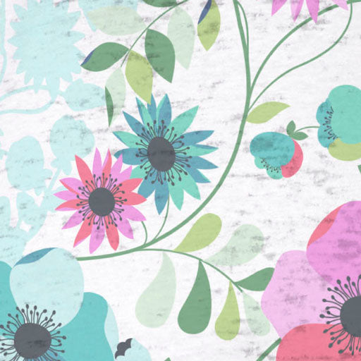 A beautiful print of blooming vines and flowering petals in pink and aqua with an aqua and white floral underlay. Designed by Diane Kappa.