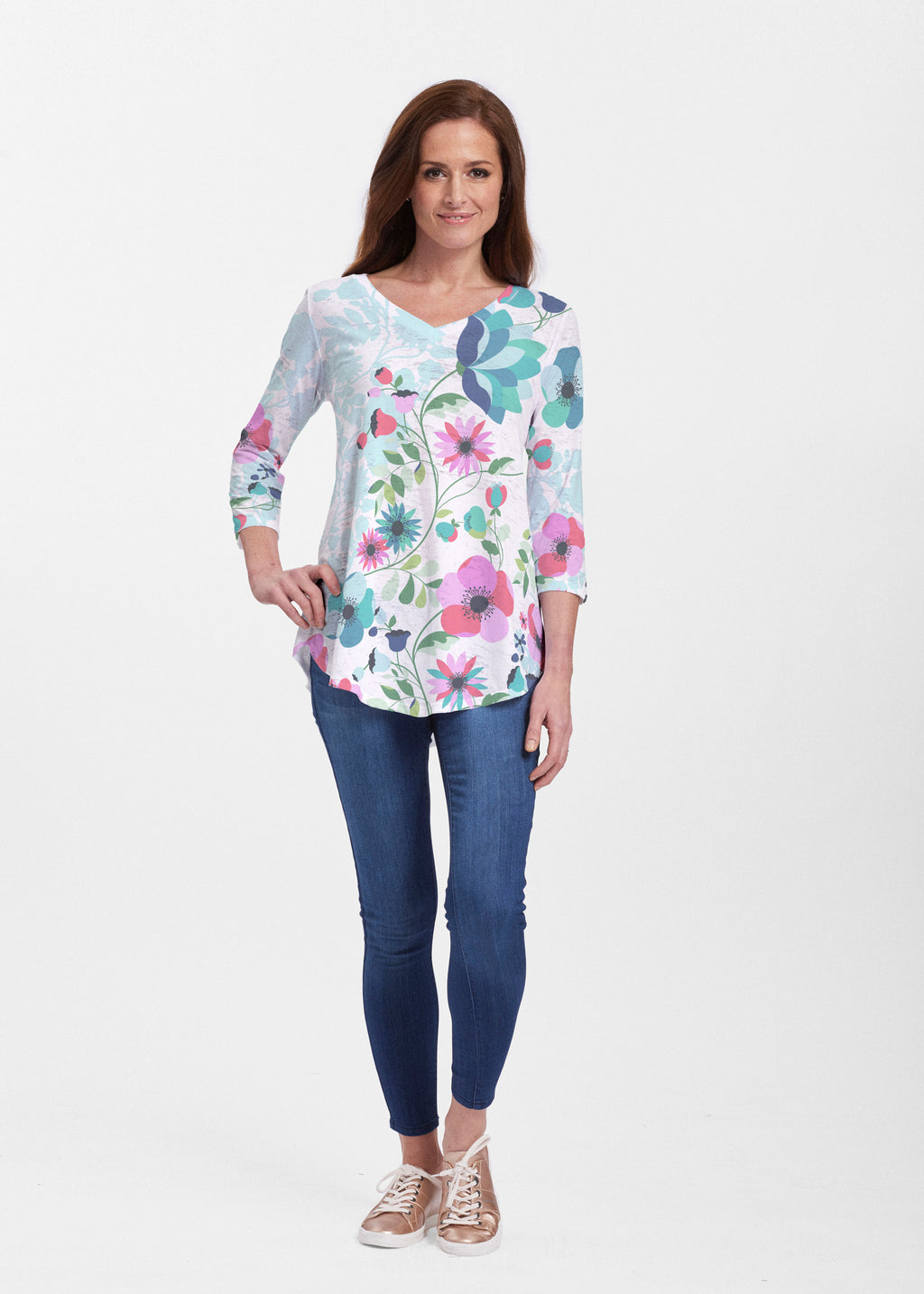This v-neck tunic in our Signature burnout fabric is forever flattering. 3/4 sleeves and a v-neck flow into a full, swinging shirttail hem.