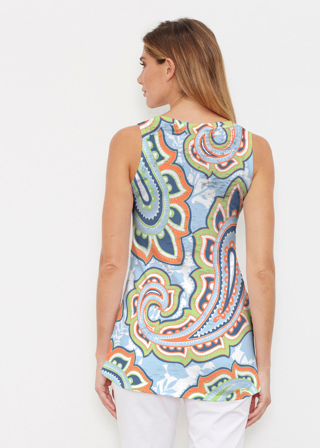 This tank is the perfect combination of an elegant shape with a sporty look. A high-low cascading hemline falls loosely over the hip in our Signature burnout fabric. No sleeves and a shallow scoop neckline give this tank its sporty vibe.
