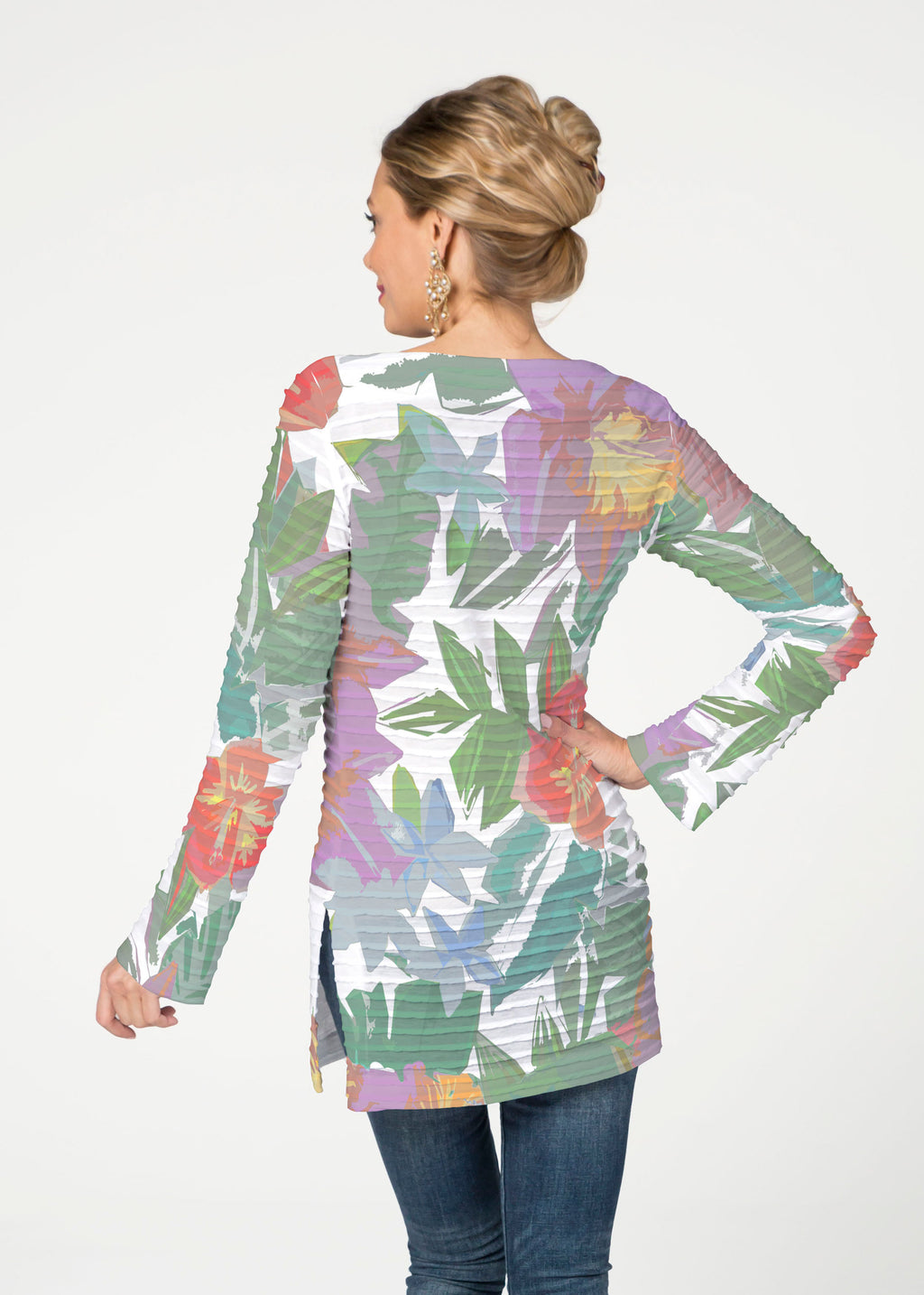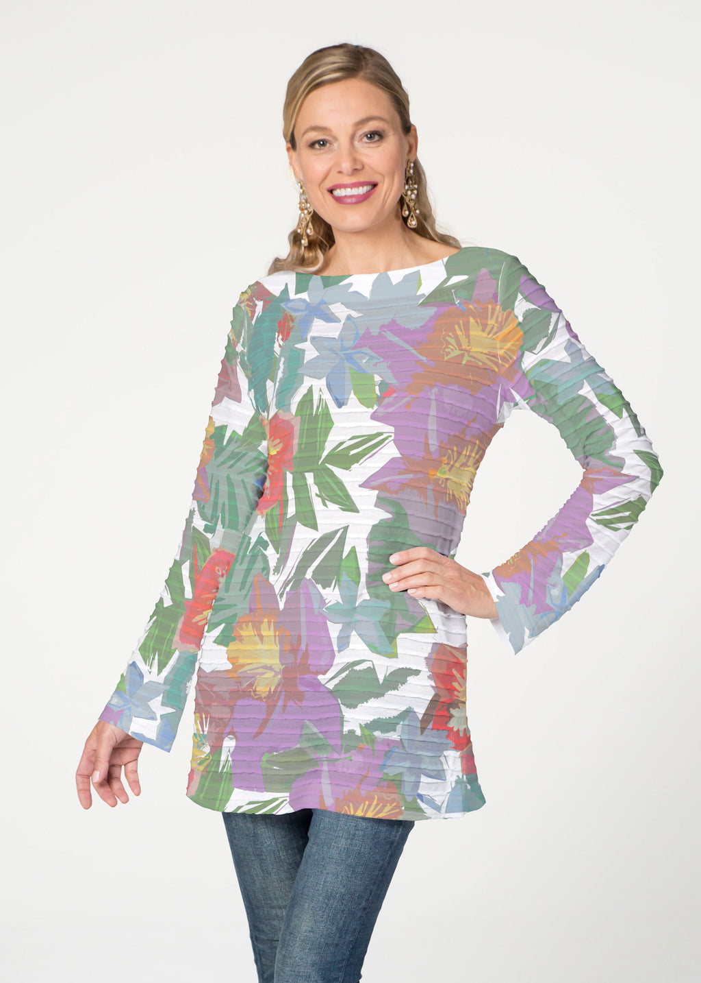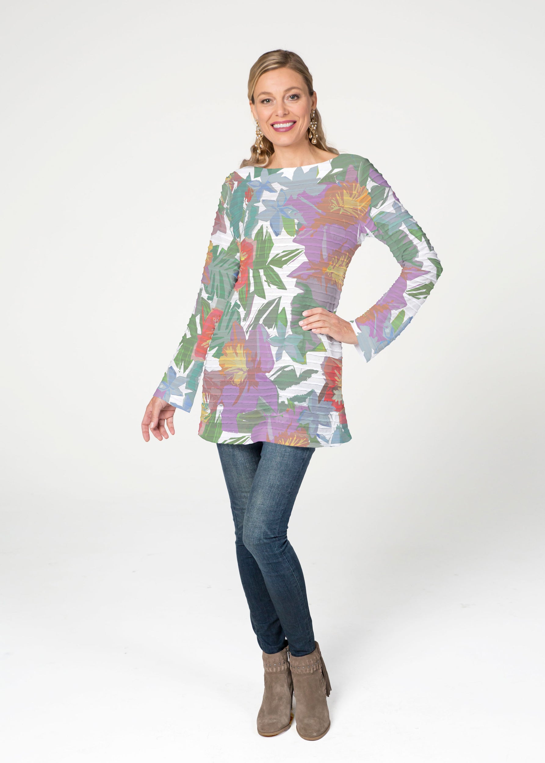 The Banded Boatneck Tunic has the soft pleated texture of our Banded fabric, making this a sophisticated, casual year round piece. A forgiving fit, side vents, with a relaxed full length sleeve combine for a flattering look. The hemline flows gently over the hip.
