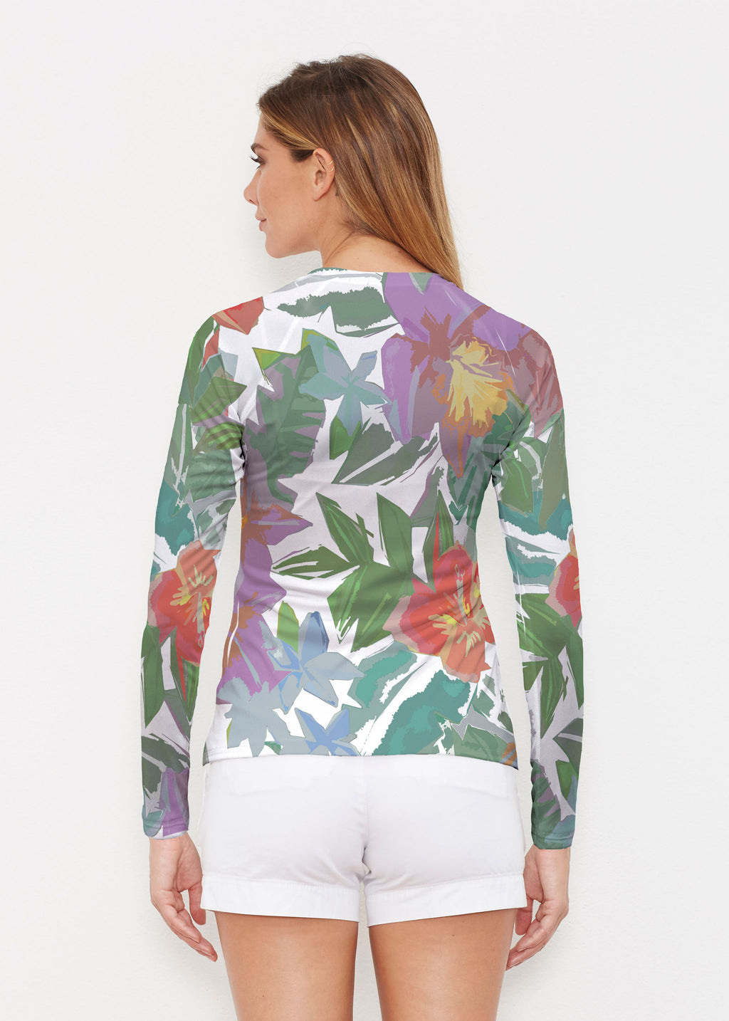 Our WHIMSY ROSE™ Safe Sun UPF 50+ long sleeve, crew neck rash guard offers versatile, beach-to-bistro style, supreme comfort, and an activewear fit. Made in a specially designed Safe Sun textile that blocks more harmful rays and provides a smart solution for those who love to swim, surf, kayak, canoe, waterski, boat, or simply relax waterside.