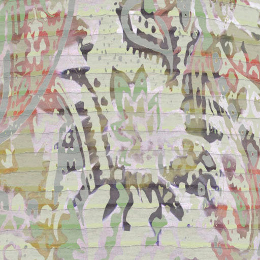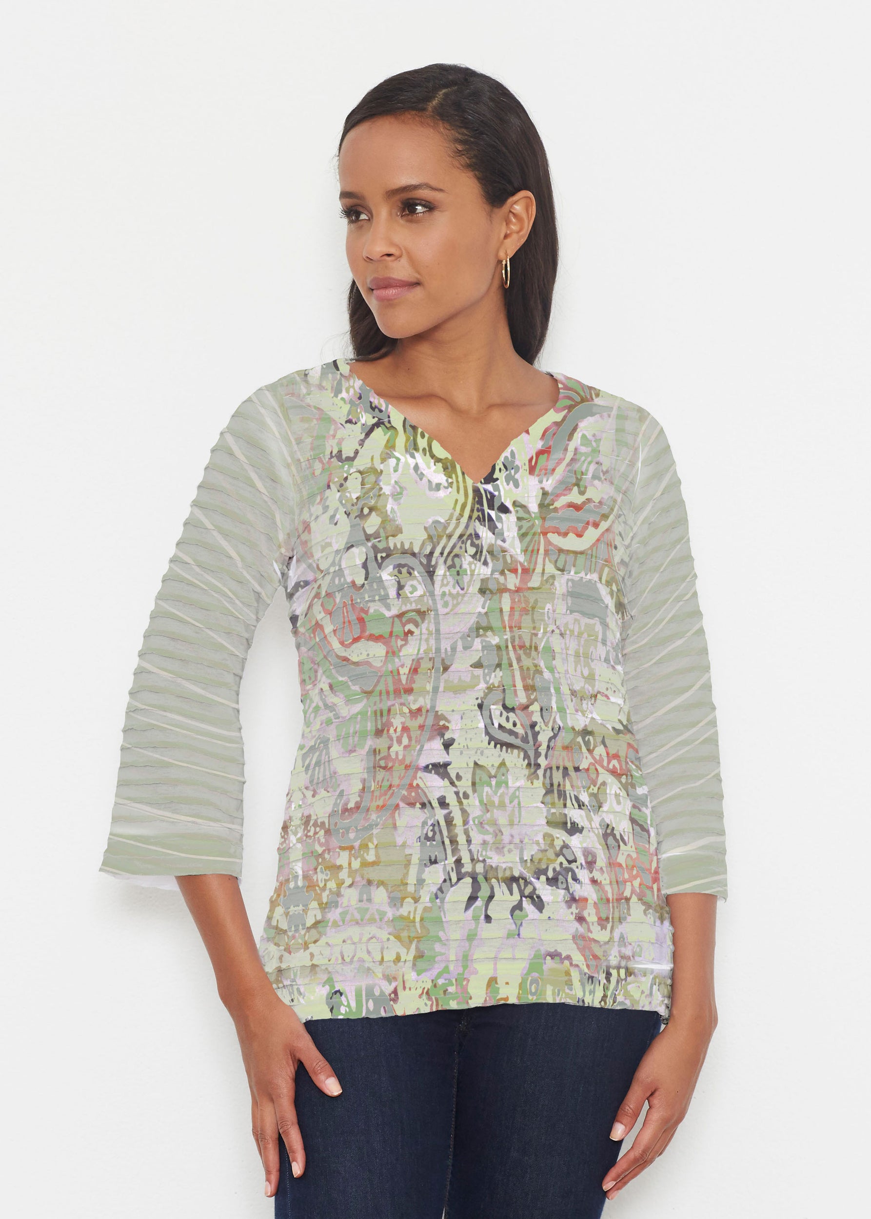 Take a walk on the wild side with this abstract print of paisley and jungle foliage with mixed striped sleeves in soft greens with red, black and grey accents. Designed by Carolyn McNeil.