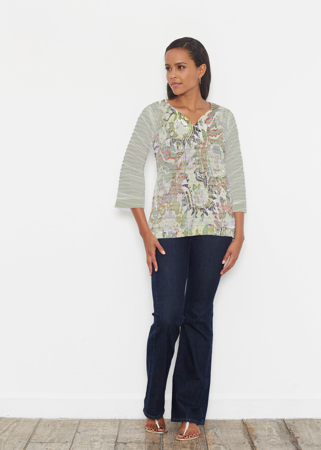 The uniquely soft, pleated texture in this Banded fabric give the 3/4 bell sleeves and sweetheart v-neck a fun and sophisticated look. Flattering side vents adorn the hemline that skims the hip.