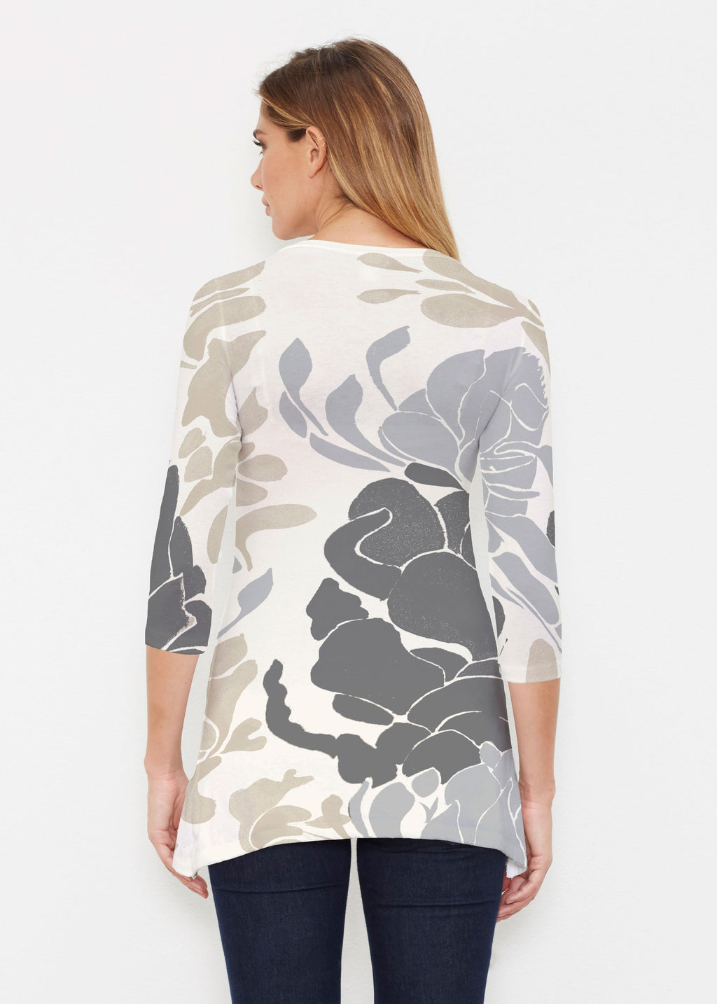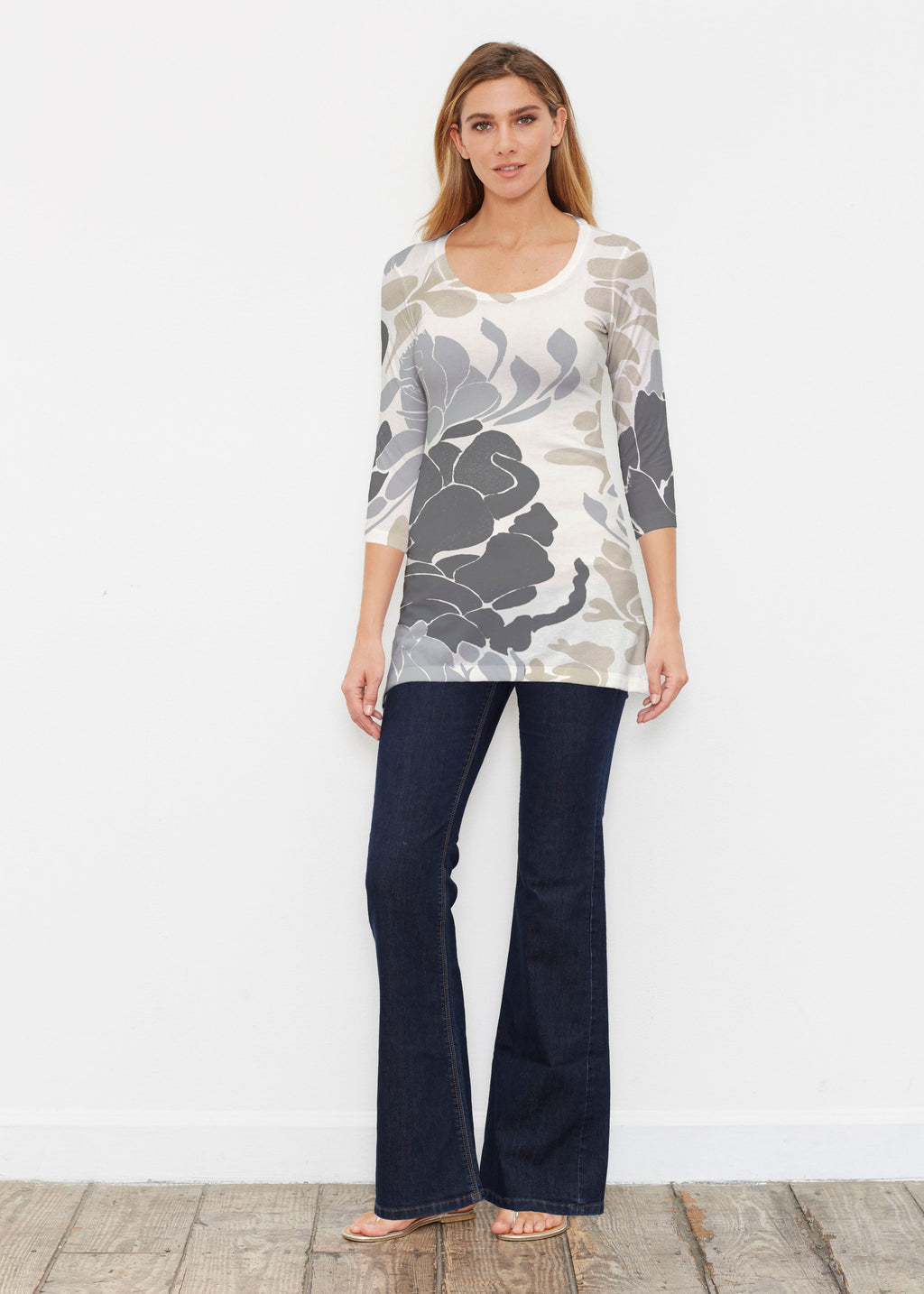 Surprising comfort and style combine in our luxurious Buttersoft blend. A delicate scoop neck, 3/4 sleeve, sweeping curved hemline falls just below the hip.
