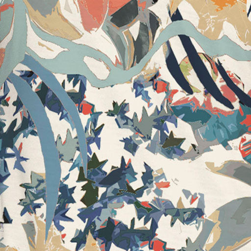 A playful mix of sketchy blue lines and watercolor blooms of orange, peach and steel blues.