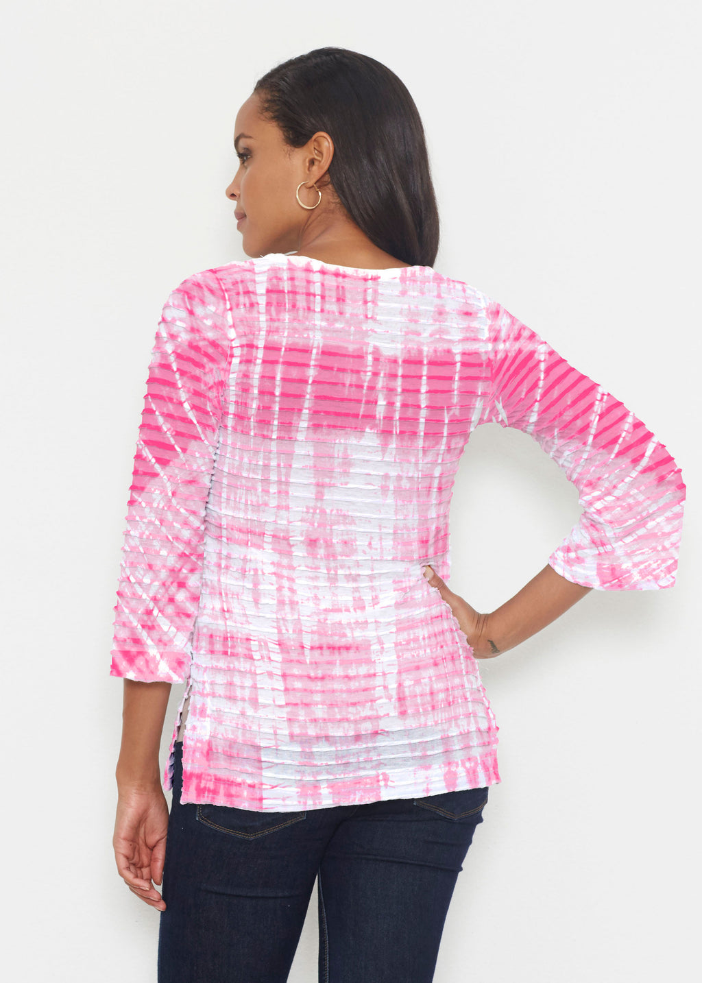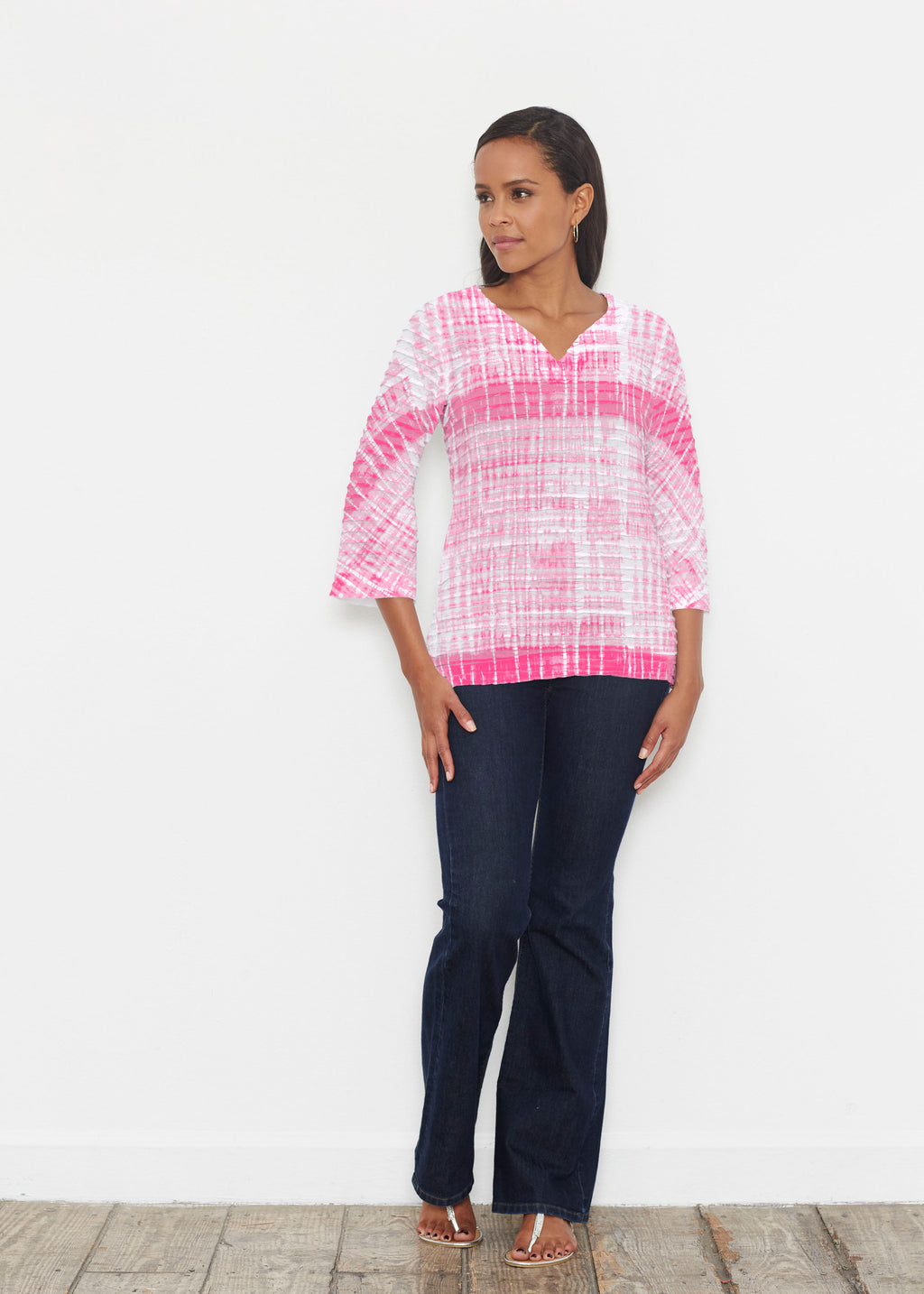 The uniquely soft, pleated texture in this Banded fabric give the 3/4 bell sleeves and sweetheart v-neck a fun and sophisticated look. Flattering side vents adorn the hemline that skims the hip.