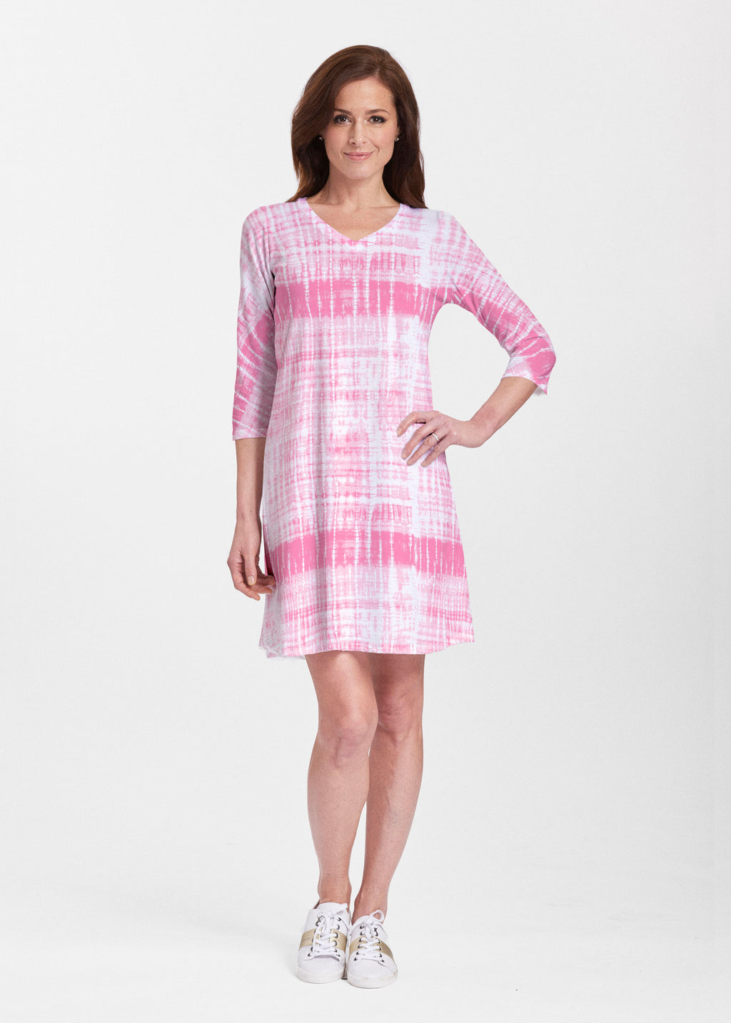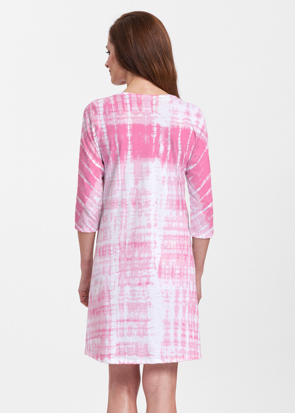 A relaxed swing silhouette with 3/4 sleeves and v-neck make up the newest edition to our Classic dress collection. Hem falls just above the knee.