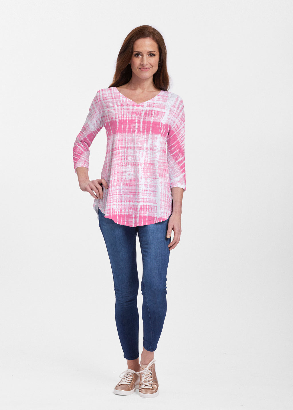 This v-neck tunic in our Signature burnout fabric is forever flattering. 3/4 sleeves and a v-neck flow into a full, swinging shirttail hem.