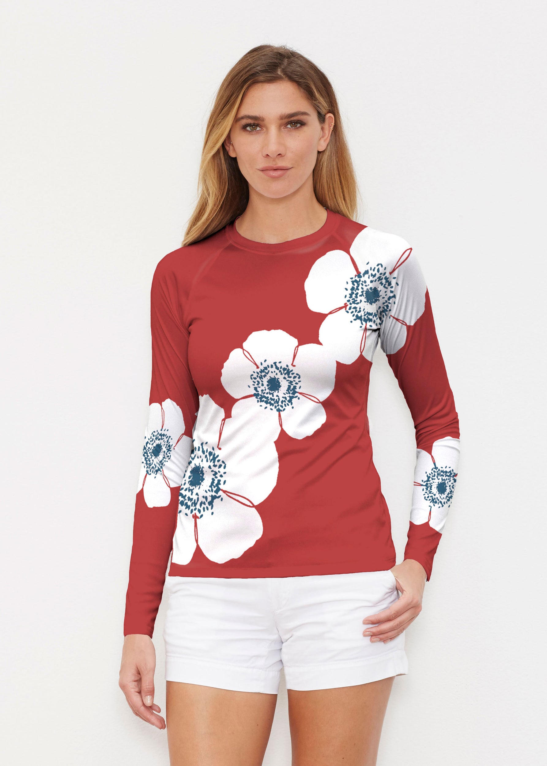 Our WHIMSY ROSE™ Safe Sun UPF 50+ long sleeve, crew neck rash guard offers versatile, beach-to-bistro style, supreme comfort, and an activewear fit. Made in a specially designed Safe Sun textile that blocks more harmful rays and provides a smart solution for those who love to swim, surf, kayak, canoe, waterski, boat, or simply relax waterside.
