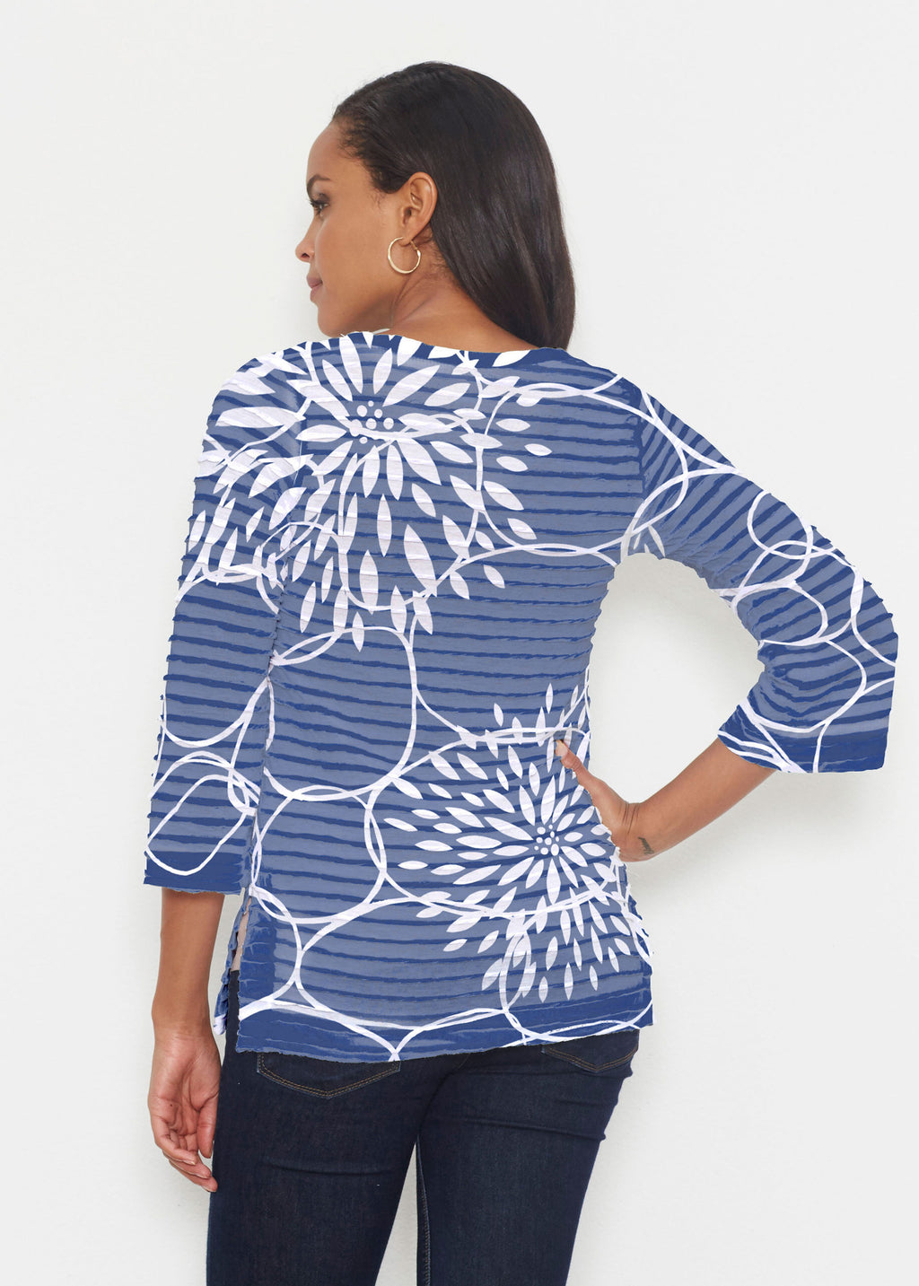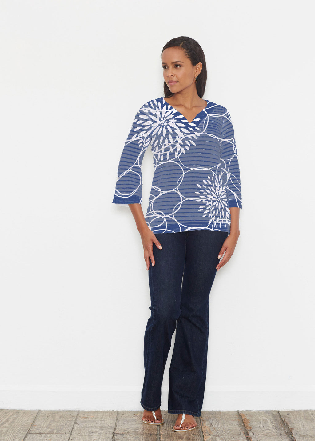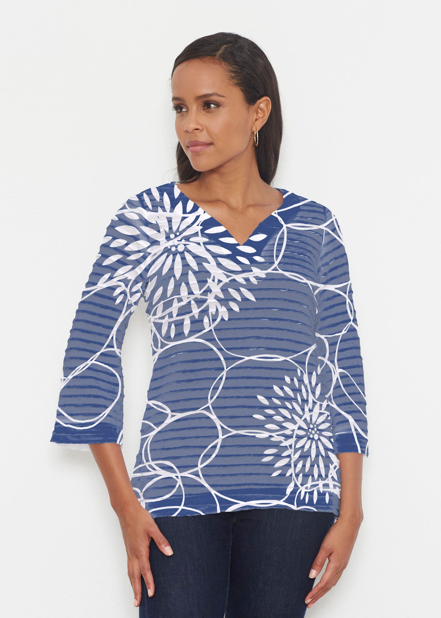 The uniquely soft, pleated texture in this Banded fabric give the 3/4 bell sleeves and sweetheart v-neck a fun and sophisticated look. Flattering side vents adorn the hemline that skims the hip.