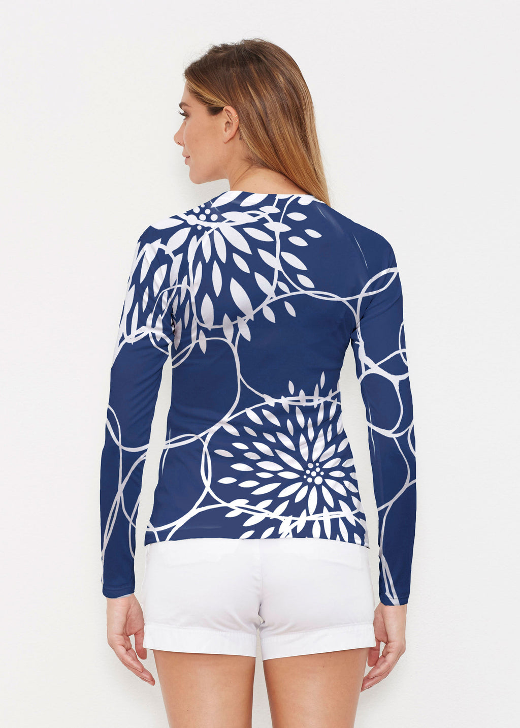 Our WHIMSY ROSE™ Safe Sun UPF 50+ long sleeve, crew neck rash guard offers versatile, beach-to-bistro style, supreme comfort, and an activewear fit. Made in a specially designed Safe Sun textile that blocks more harmful rays and provides a smart solution for those who love to swim, surf, kayak, canoe, waterski, boat, or simply relax waterside.