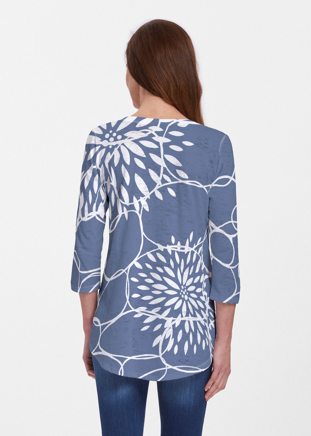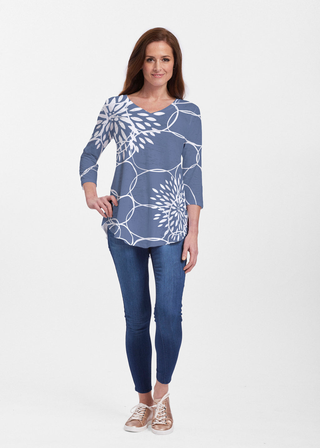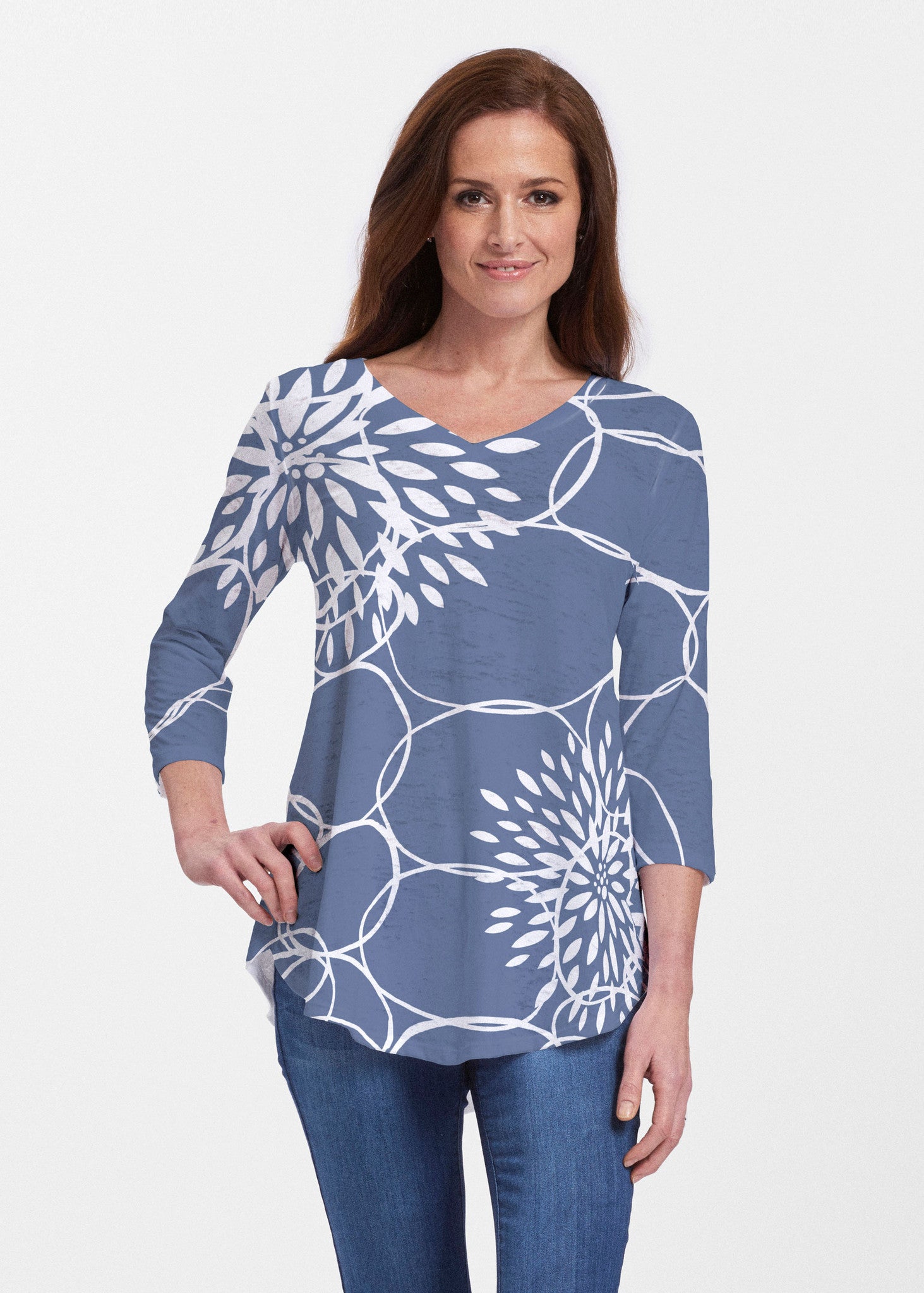 This v-neck tunic in our Signature burnout fabric is forever flattering. 3/4 sleeves and a v-neck flow into a full, swinging shirttail hem.