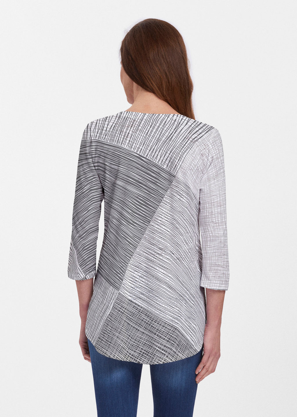This v-neck tunic in our Signature burnout fabric is forever flattering. 3/4 sleeves and a v-neck flow into a full, swinging shirttail hem.