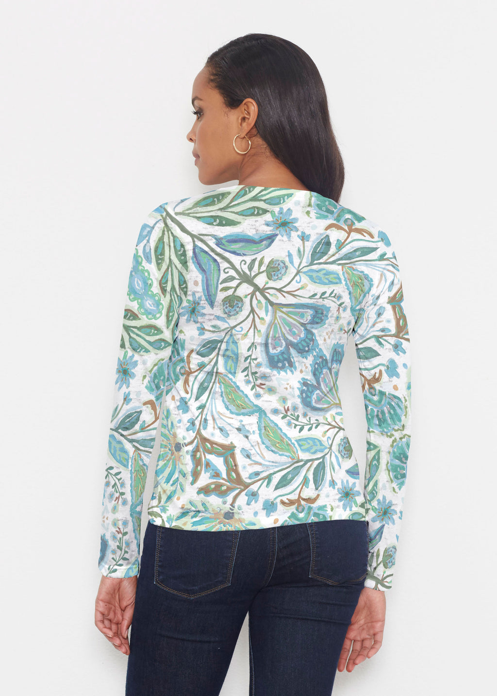 A stunning and playful floral print in green, aqua and blue designed by Jeanetta Gonzales.