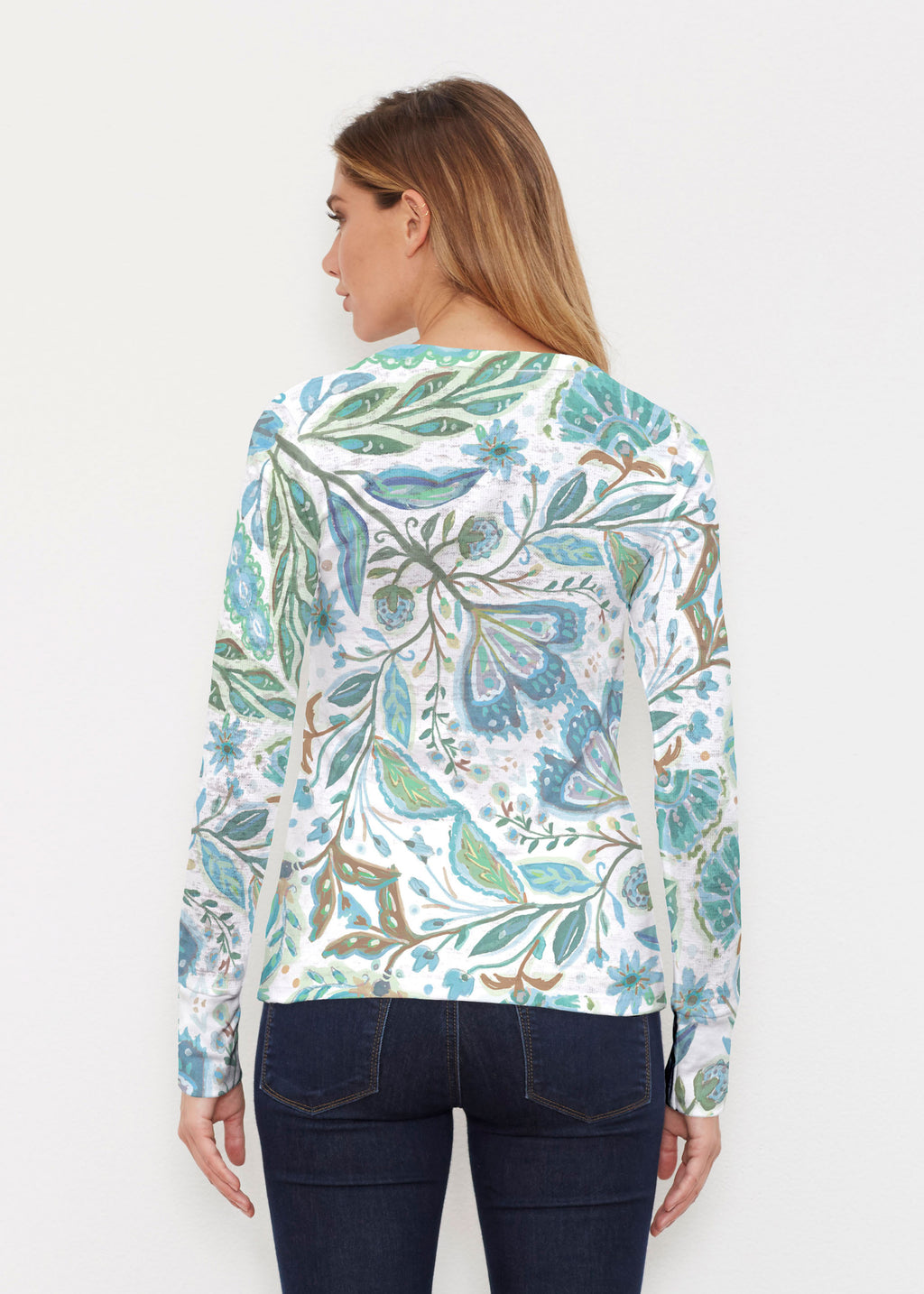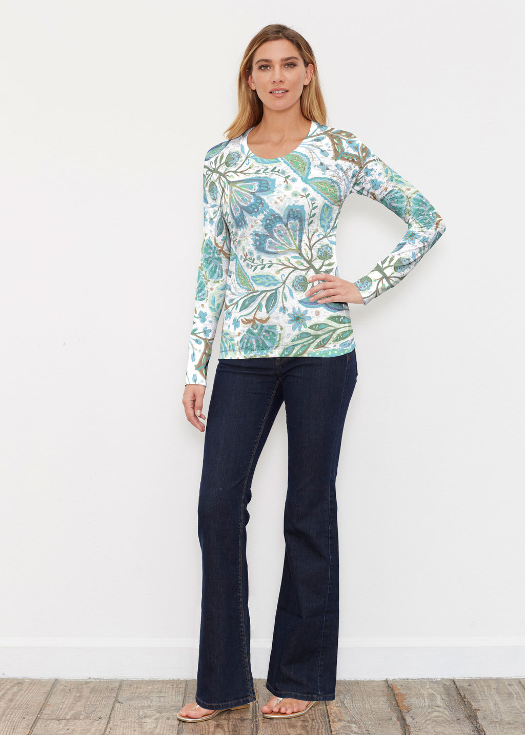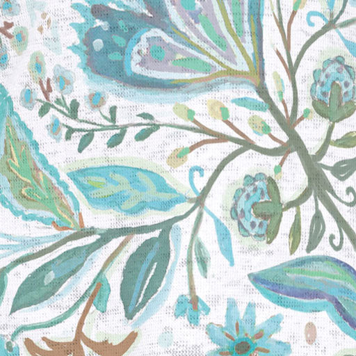 A stunning and playful floral print in green, aqua and blue designed by Jeanetta Gonzales.