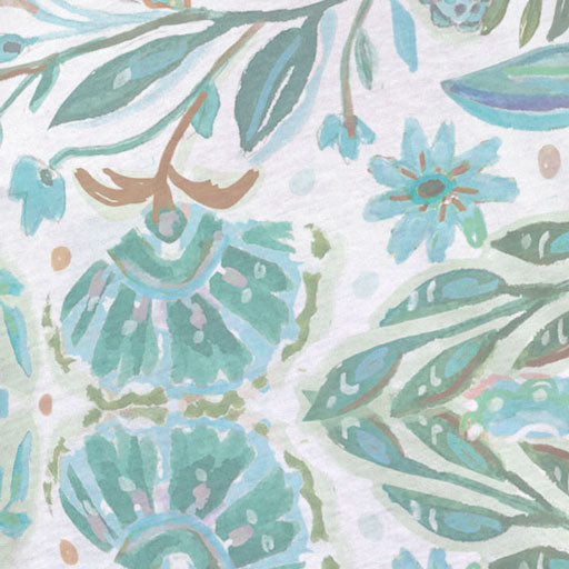 A stunning and playful floral print in green, aqua and blue designed by Jeanetta Gonzales.