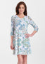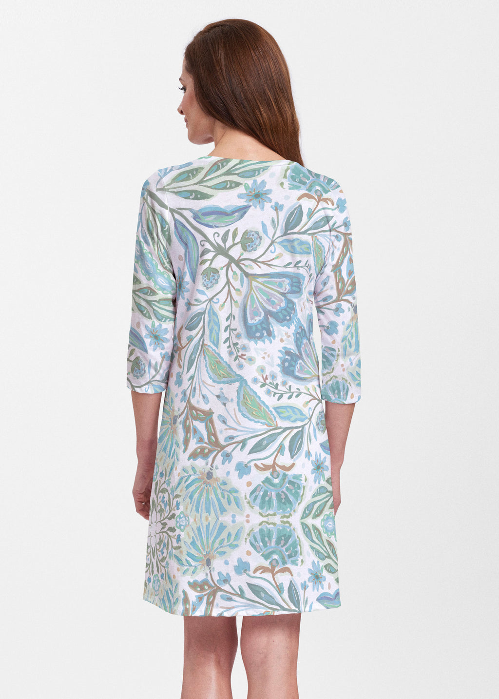 A relaxed swing silhouette with 3/4 sleeves and v-neck make up the newest edition to our Classic dress collection. Hem falls just above the knee.