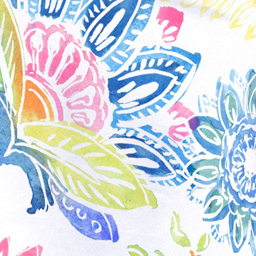 A brightly colored summertime inspired print with bold shades of blue, pink, green, purple and orange. Designed by Diane Kappa.