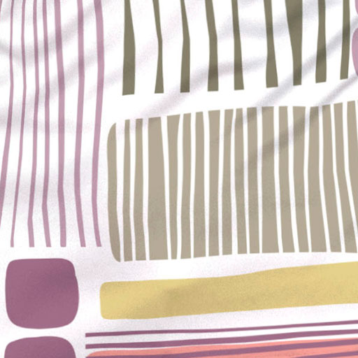 A touch of mid-century modern using abstract lines and blocks with mixed floral sleeves in shades of purple, green, coral and gold designed by Diane Kappa.