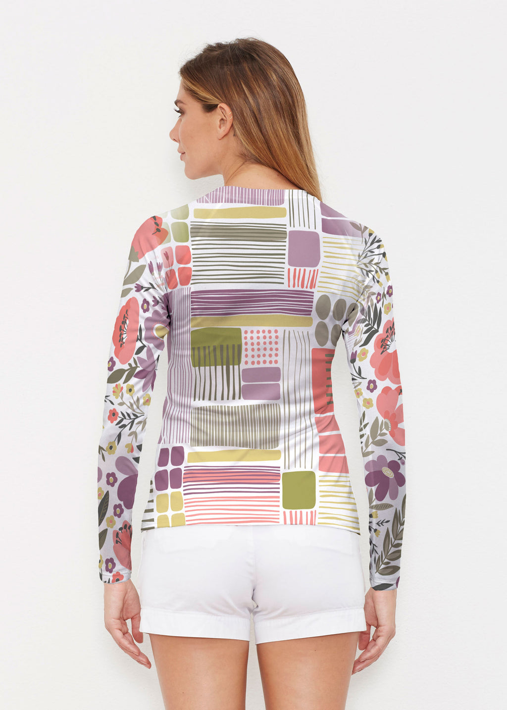 Our WHIMSY ROSE™ Safe Sun UPF 50+ long sleeve, crew neck rash guard offers versatile, beach-to-bistro style, supreme comfort, and an activewear fit. Made in a specially designed Safe Sun textile that blocks more harmful rays and provides a smart solution for those who love to swim, surf, kayak, canoe, waterski, boat, or simply relax waterside.