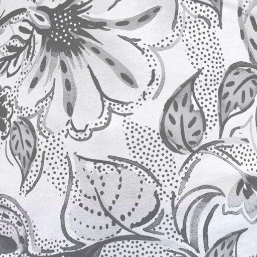 A striking fun floral print with watercolor marks and dots in shades of grey and black. Designed by Susan Werner.