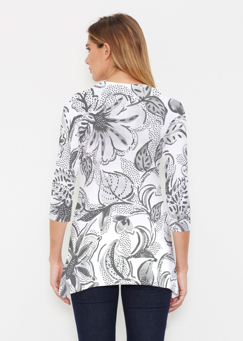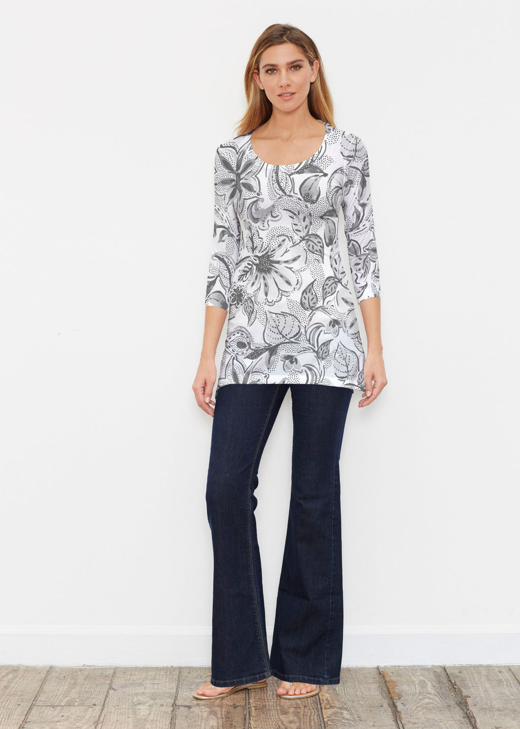 Surprising comfort and style combine in our luxurious Buttersoft blend. A delicate scoop neck, 3/4 sleeve, sweeping curved hemline falls just below the hip.