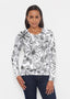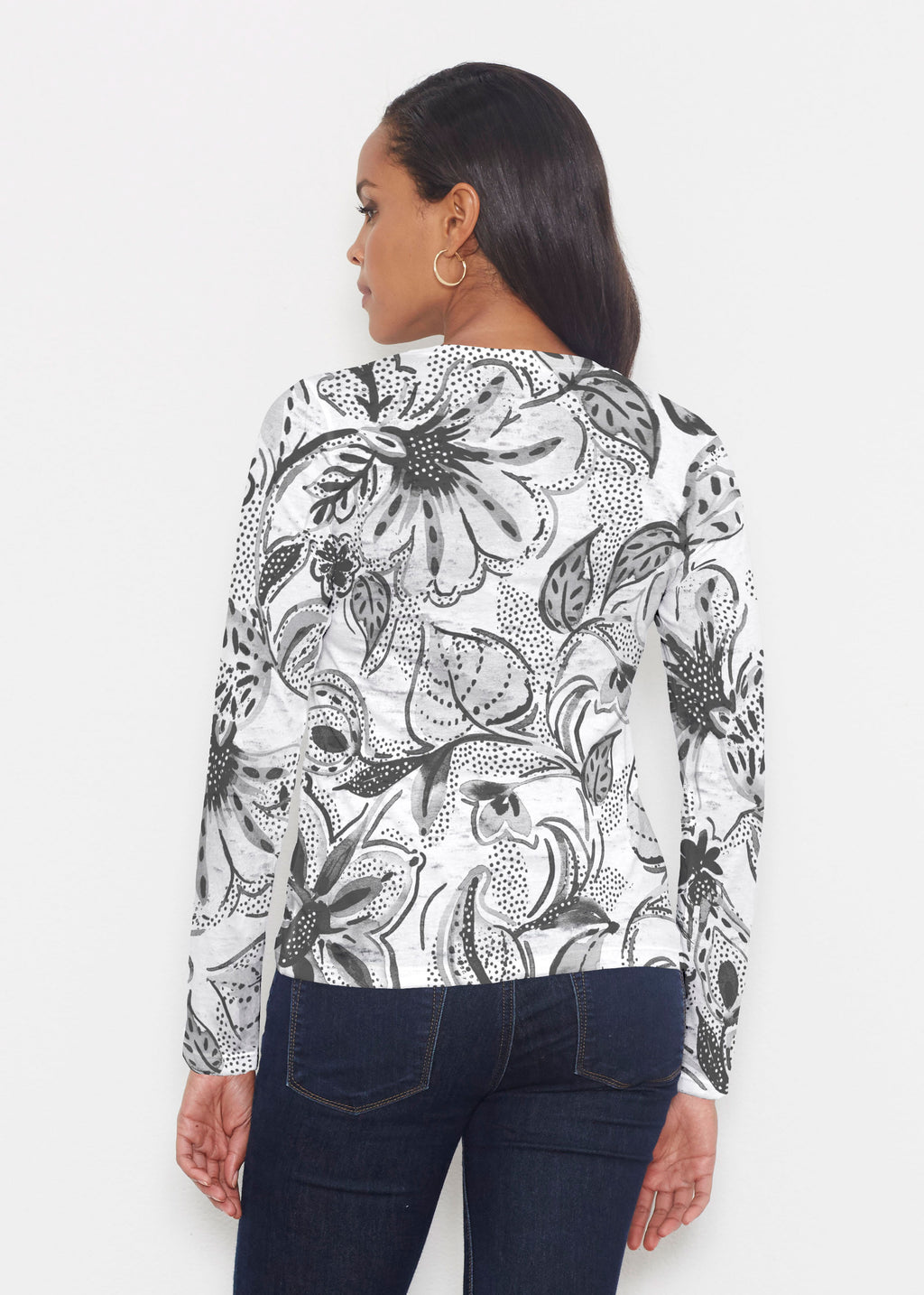 A striking fun floral print with watercolor marks and dots in shades of grey and black. Designed by Susan Werner.