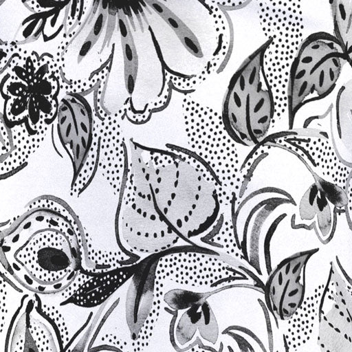 A striking fun floral print with watercolor marks and dots in shades of grey and black. Designed by Susan Werner.