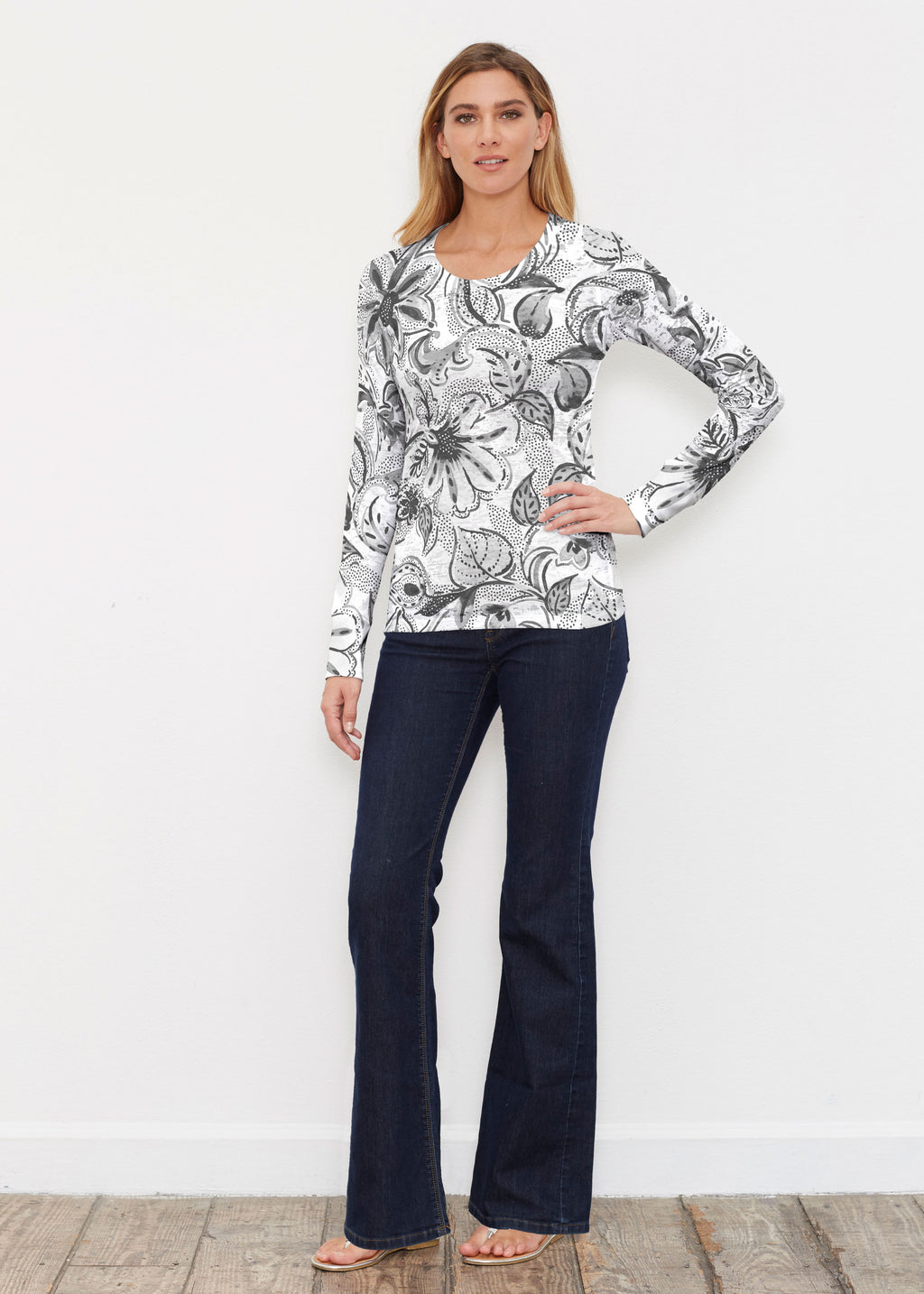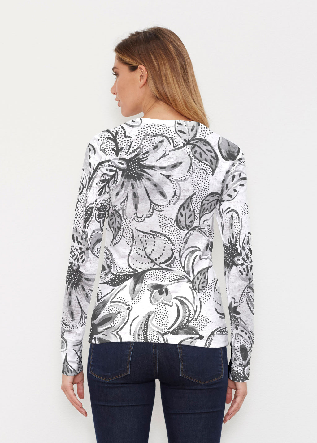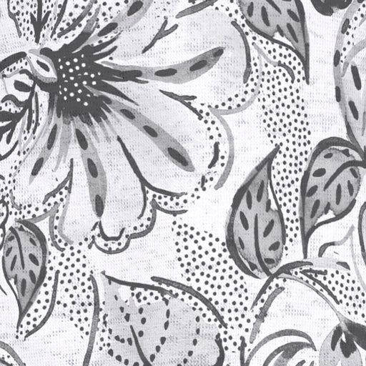 A striking fun floral print with watercolor marks and dots in shades of grey and black. Designed by Susan Werner.